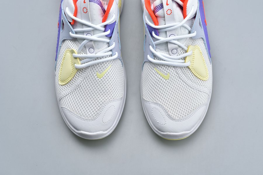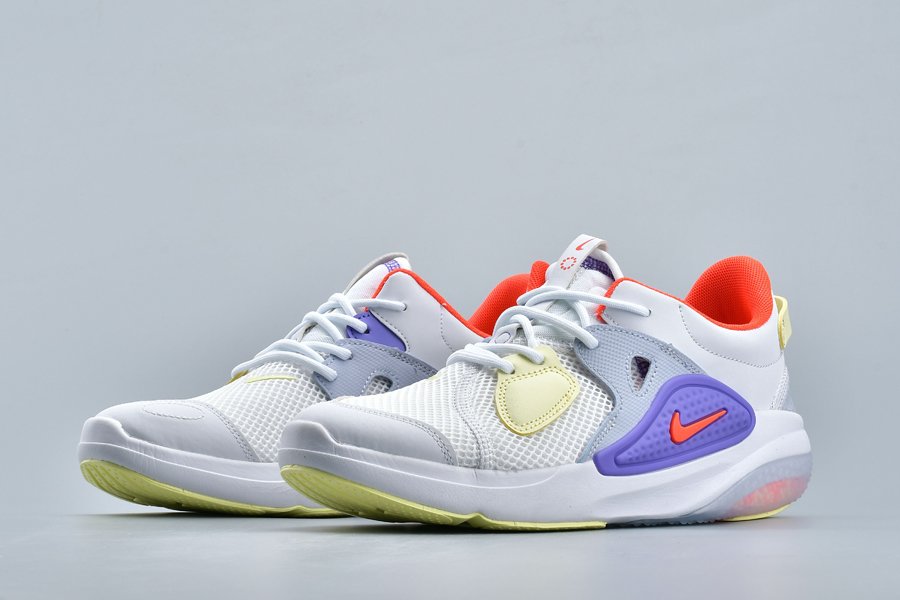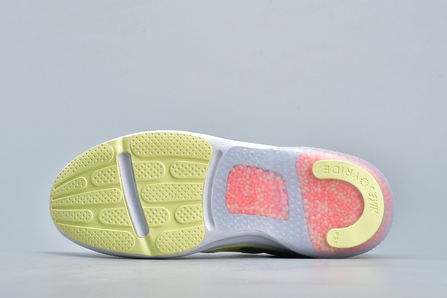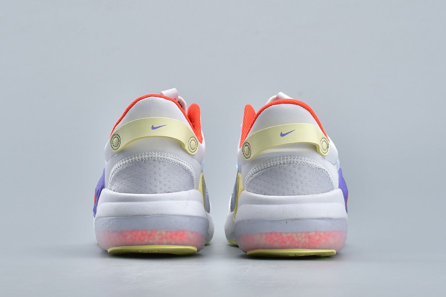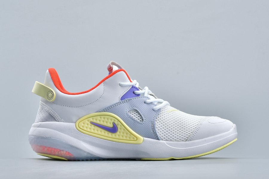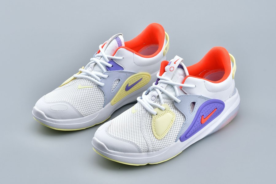 Released in fall 2019, the Nike Joyride CC ‘Bright Crimson’ with violet-and-yellow trim is designed for lightweight breathability, durability and personalized cushioning. The sneaker has a ventilated mesh upper defined by stitched support overlays and dimpled, molded side panels for air circulation and structural strength. Underfoot, a Cushlon foam midsole includes sections of TPE bead technology, meant to soften steps by reacting to each impact for a responsive, springy feel.