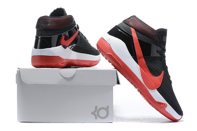 Starting off with a heavy dose of black all throughout the upper, this appealing colorway of the Nike KD 13 takes on a grid pattern on the upper along with patent leather on the heel counter and mesh on the ankle/heel. Vibrant University Red detailing is then placed on the Swooshes, tongue and insole branding, and the rubber outsole.