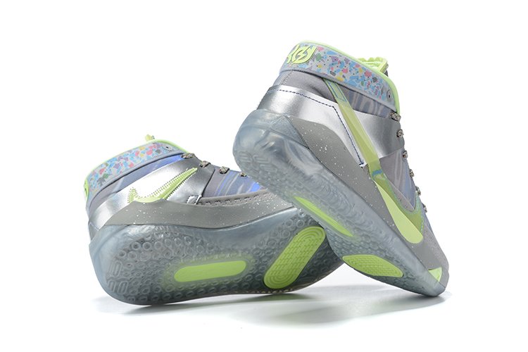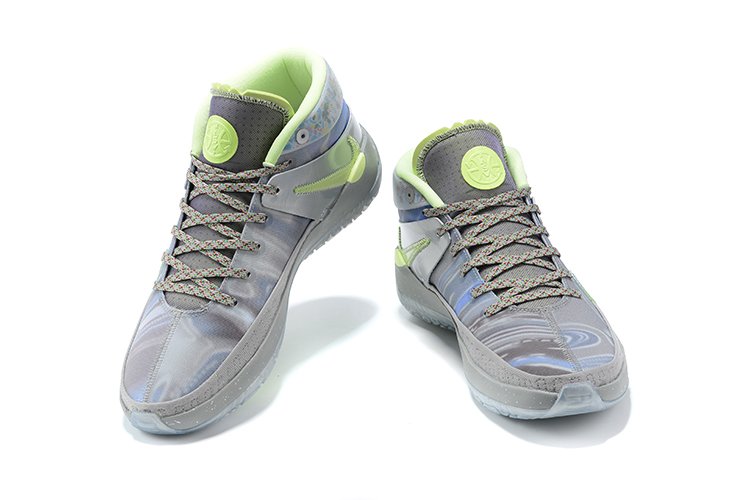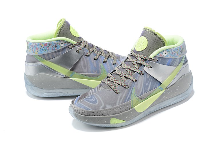 This Nike KD 13 comes dressed in a Platinum Tint and Barely Volt color combination. First, the pair comes with a Platinum hue across the upper while Multicolor patterns that form different designs run across the base. Next, iridescent lands on the flaps on the side, and Volt adorns the Swoosh logos, tongue branding, and liner. Lastly, we have Nike’s Grind recycled material on the padded collar. Finally, a translucent outsole finishes the look.