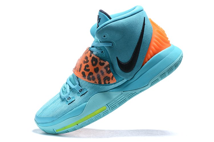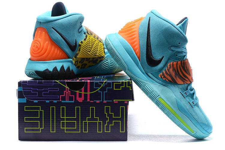 The Kyrie 6 EP ‘Animal Print’ combines a vibrant color palette with mixed patterns, resulting in a unique design made to turn heads on the basketball court. Kyrie Irving’s sixth signature shoe features an Oracle Aqua finish on the upper, built with a blend of breathable mesh and suede. The teal hue is contrasted by a Total Orange heel piece, along with yellow and orange midfoot straps that sport tiger stripes on the right foot and leopard spots on the left.