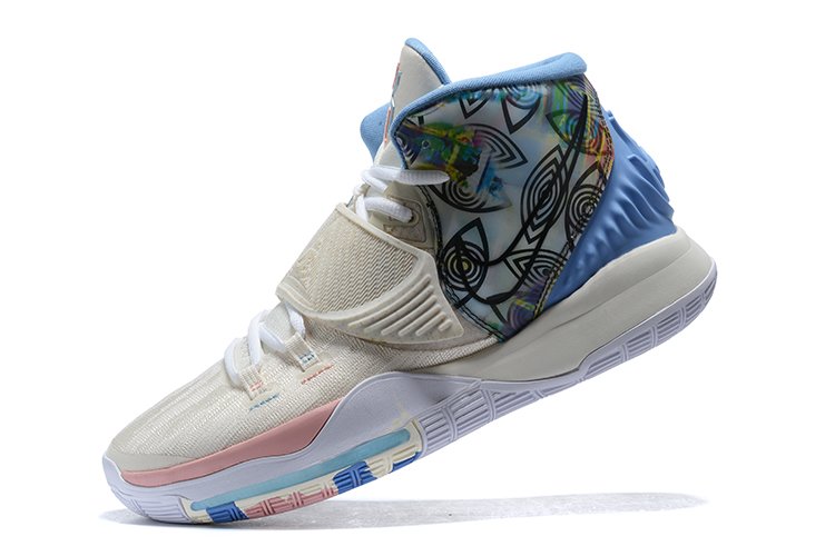 This Nike Kyrie 6 Pre-Heat “Los Angeles” sports a pastel palette across the textile upper, external heel piece and logos. A cityscape graphic details the collar and a palm tree decorates the midfoot strap. The sneaker includes a two-tone foam midsole with a Zoom Air Turbo forefoot and marbled rubber outsole.
