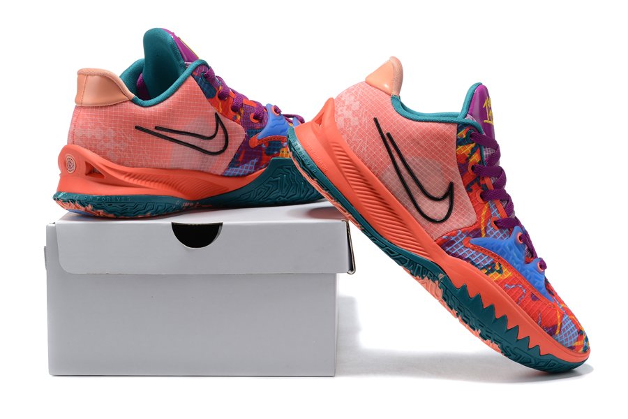 This eye-catching Nike Kyrie Low 4 “1 World 1 People” takes on a predominantly peach base with complementing hues of bright yellow, electric blue, and purple form abstract graphics on the toe box and eyestay areas. In terms of branding, black outlined Swooshes are spotlighted on both the medial and lateral walls, while Irving’s insignia is featured on the tongue and insoles. Lastly, “1 World 1 People” is branded on the right tongue.
