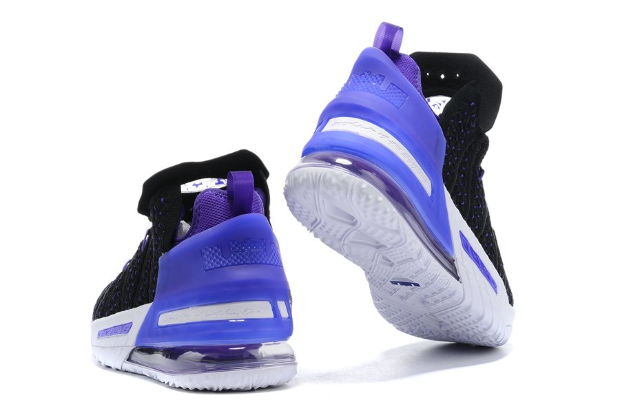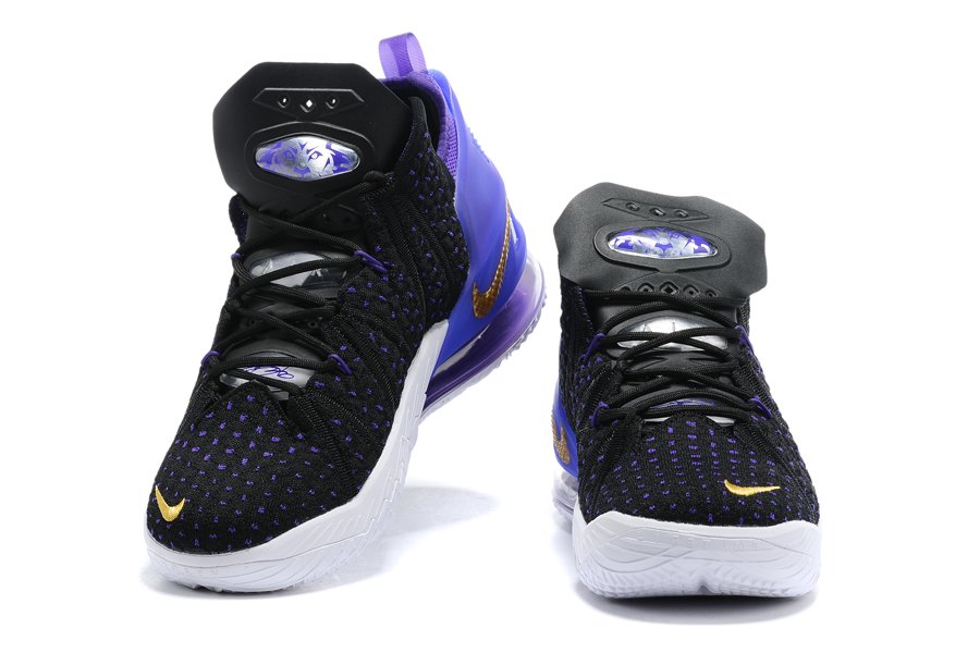 The Nike LeBron 18 Lakers comes dressed in a Black, Metallic Gold, Court Purple, and White color scheme. Done in a predominantly Black Knitposite 2.0 upper, the shoe’s base is contrasted by the Purple thread and durable molded heel clip. Other details on the shoe include the Gold Swooshes on the toe and medial heel, the “LeBron James” in Lakers font printed on the insoles and a full-length Air Zoom unit combined with a Max AIR unit in the heel.