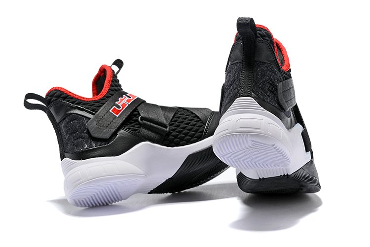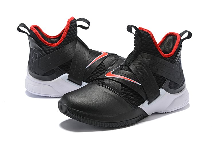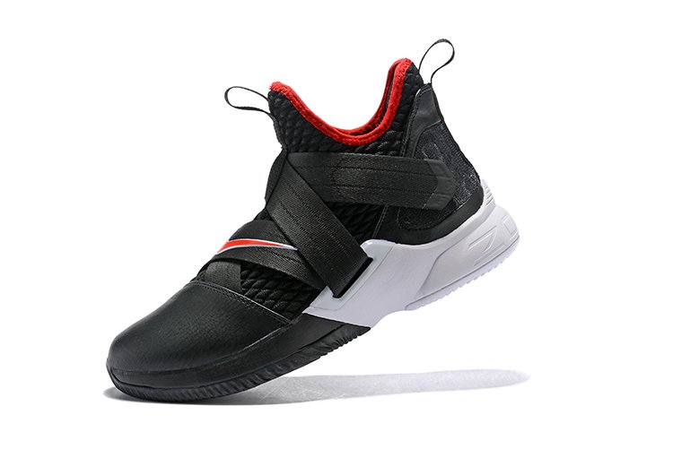 Dressed in a Black, University Red and White color scheme. This Nike LeBron Soldier 12 features a Black upper built with a mix of leather and mesh with its signature cross-strap. Red accents are used on the Swoosh/LeBron logos and heel collar atop a White/Black rubber outsole.