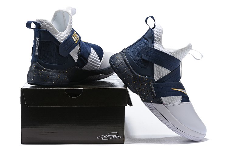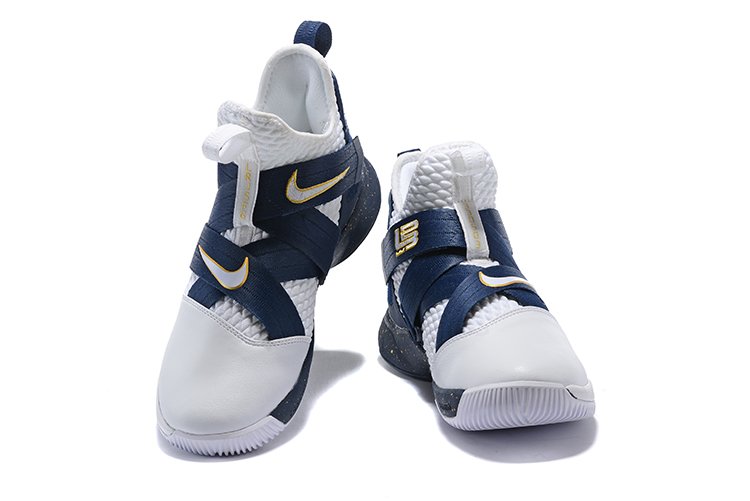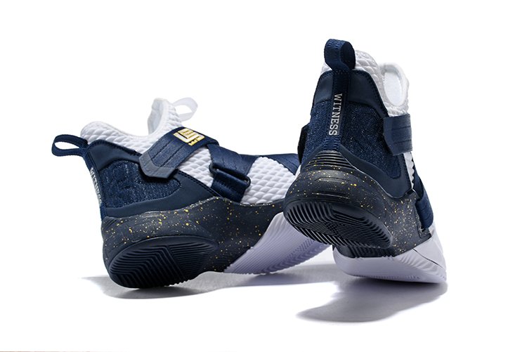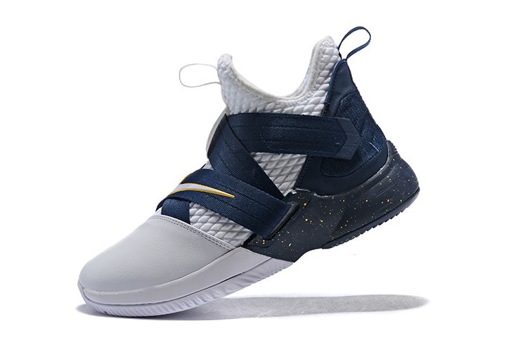 It features a White upper with Navy detailing and luxurious hits of Gold on the “LJ23” logo, outlining the Nike Swoosh and speckling on the sole.