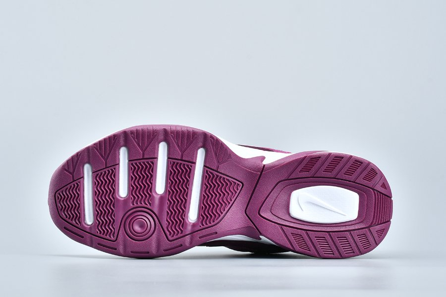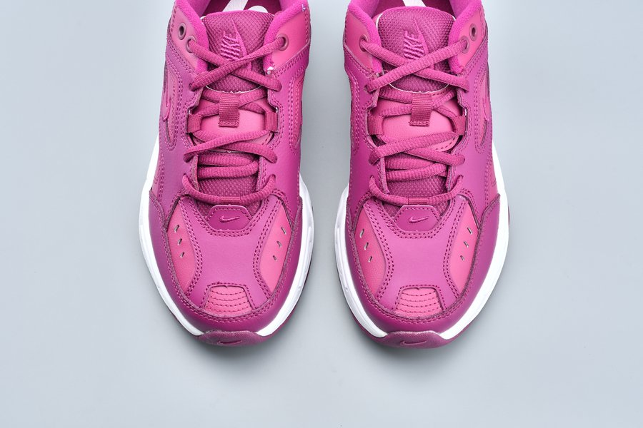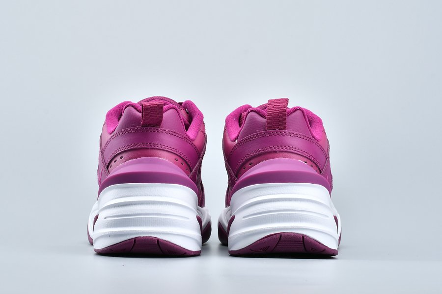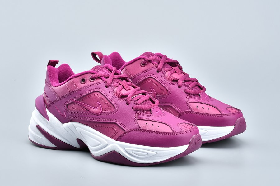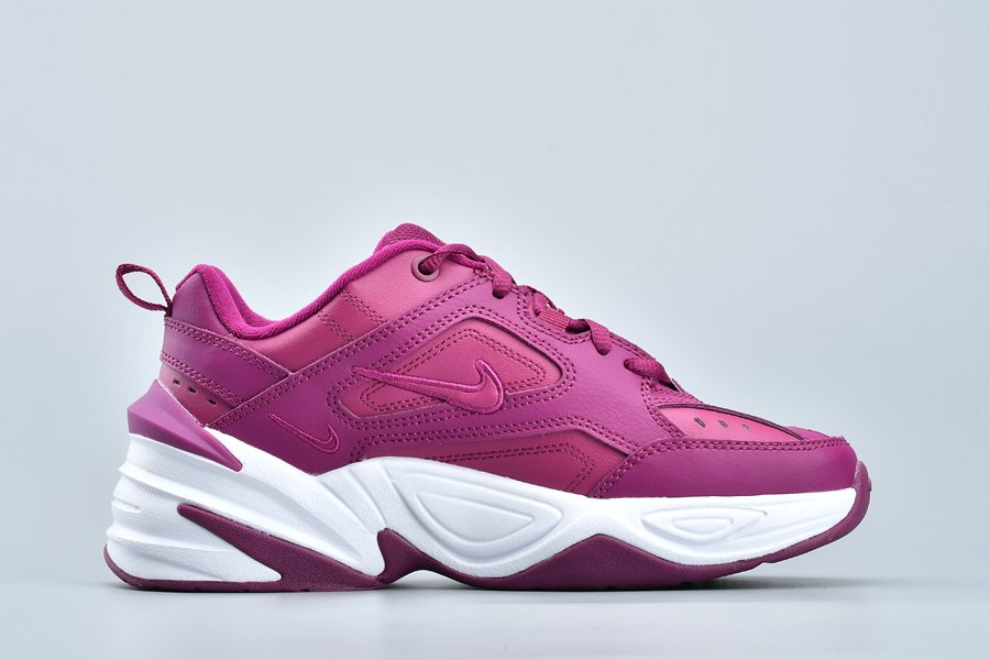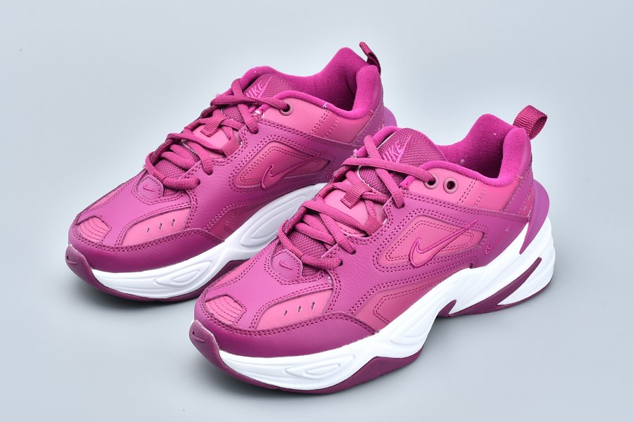 The multi-panelled leather upper is completely overtaken in the deep pink shade, which also lands on the stitching, laces, heel tab and tongue. Even the small Swoosh on the lateral side is camouflaged in the same color, as is the futuristic-looking heel counter. To contrast, the bulky midsole appears in crisp white, and a berry-toned outsole completes the look.