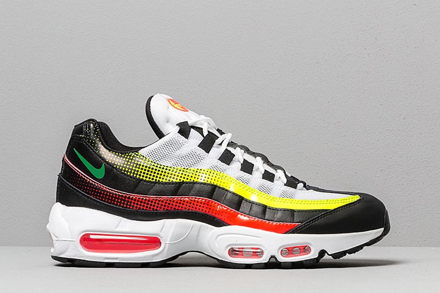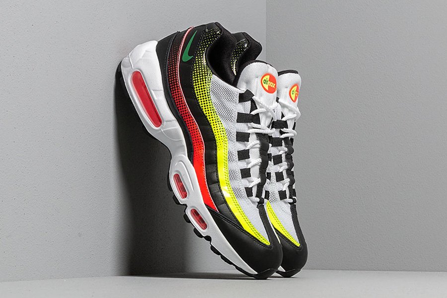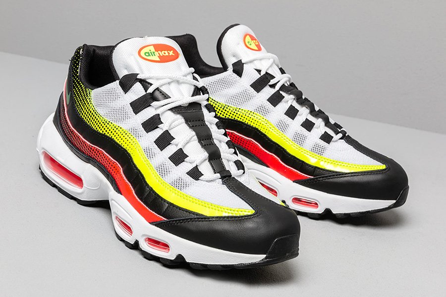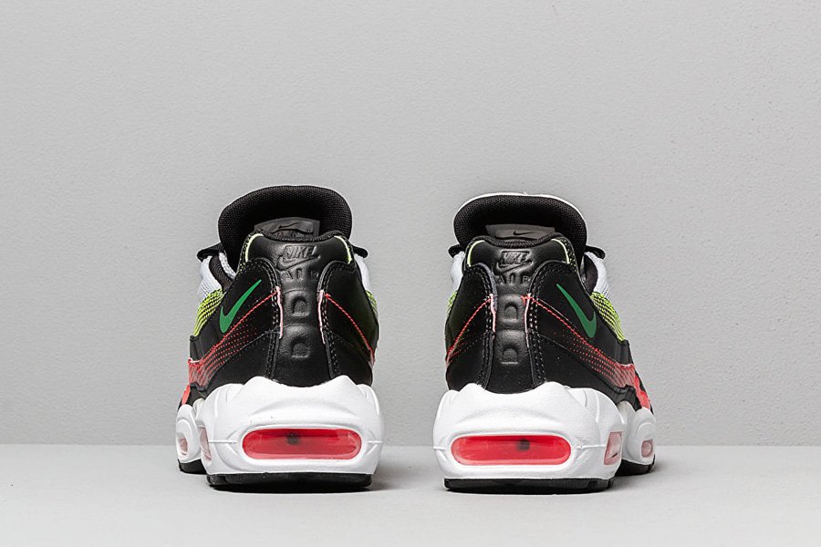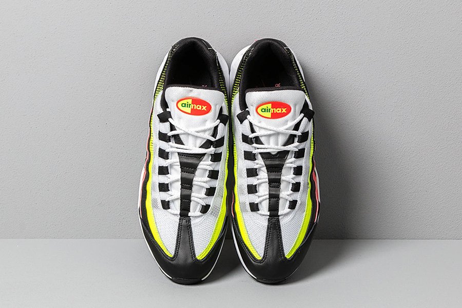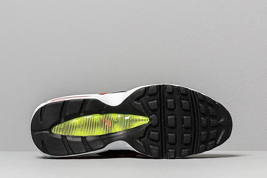 This new iteration of the Nike Air Max 95 appears to be constructed out of a combination of leather, neoprene and nylon. It comes dressed in a Black sharply contrasted by the Neon and Red overlays noted on the quarter panel and heel region. More of the same bold hues can be found on the insoles and tongue branding. White cleans things up a bit as it can be found on the midsole and lace eyelets. A Black rubber outsole and Black laces round out the main features of the shoe.