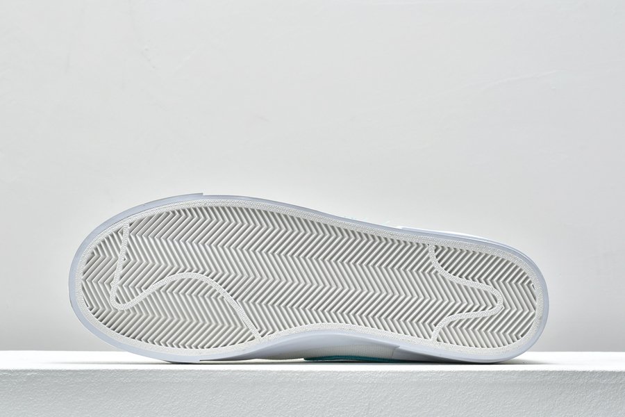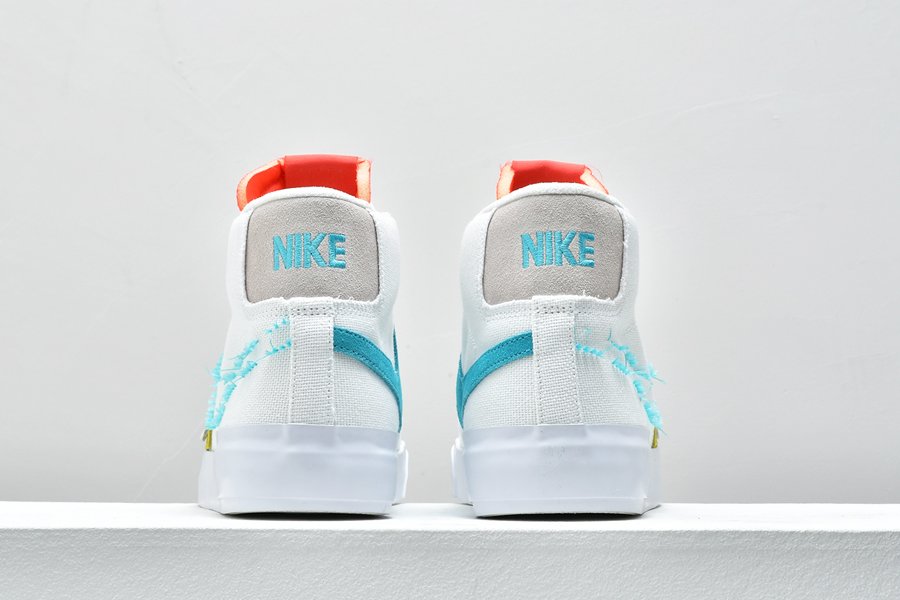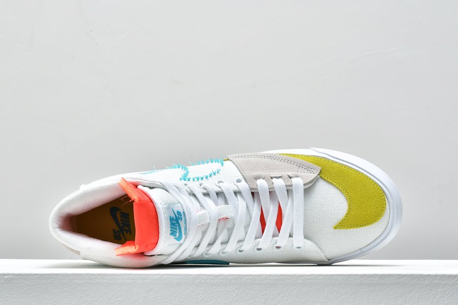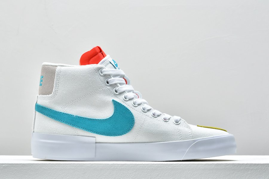This Nike SB Blazer Mid Edge starts off with a white canvas construction on the upper which is then slightly contrasted by grey suede overlays on the midfoot as well as the heel tab. Bursts of color are seen on the new Pea Green Swoosh that appears on the toe as well as on the bright blue ripped-stitched Swooshes on the lateral side panels and the suede Swooshes on the medial sides. Pope of orange on the dual exposed foam tongues, blue Nike branding on the tongues and heels, and a white herringbone rubber outsole wrap things up on this Nike SB Blazer Mid Edge.