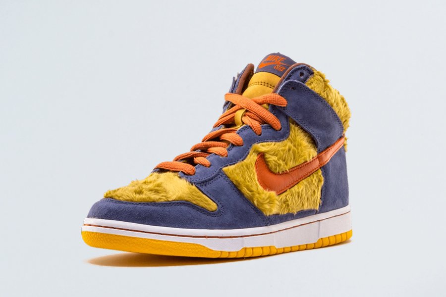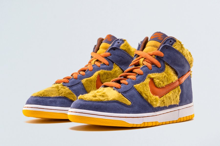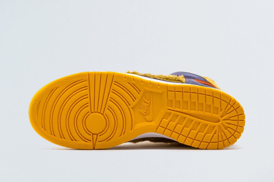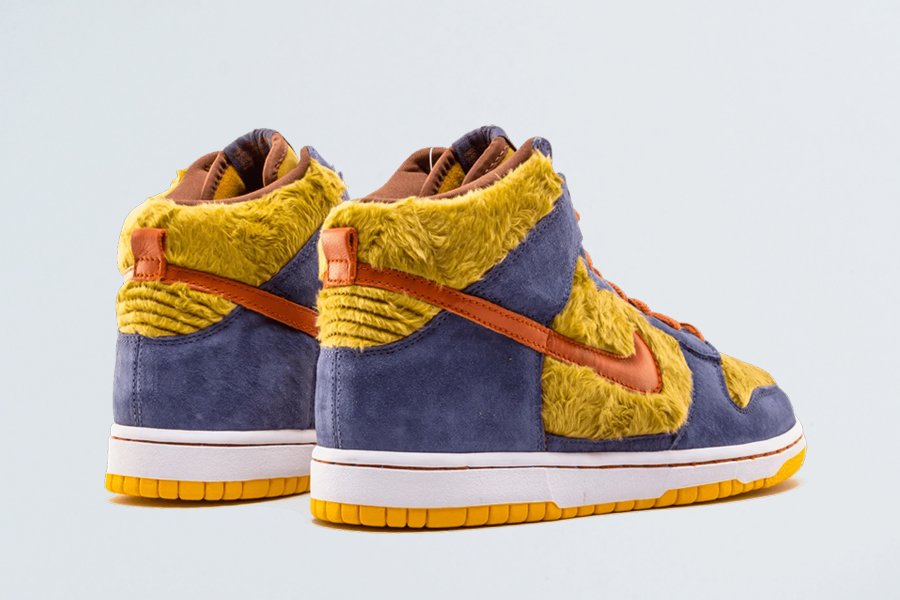 The Nike Dunk High Pro SB “Papa Bear Three Bears” light umber/hot house is part of the Three Bears pack/collection. The colors are by James Keoni Arizumi and it takes its inspiration from yet another Medicom collaboration with Nike SB. They feature a blue suede upper with fur on the toe box, quarter panels, and around the heel of the shoe. The orange laces and Nike swoosh are nice accents, as well as the yellow outsole. The inner sole of the shoe features a picture of the papa bear, which is a nice addition.