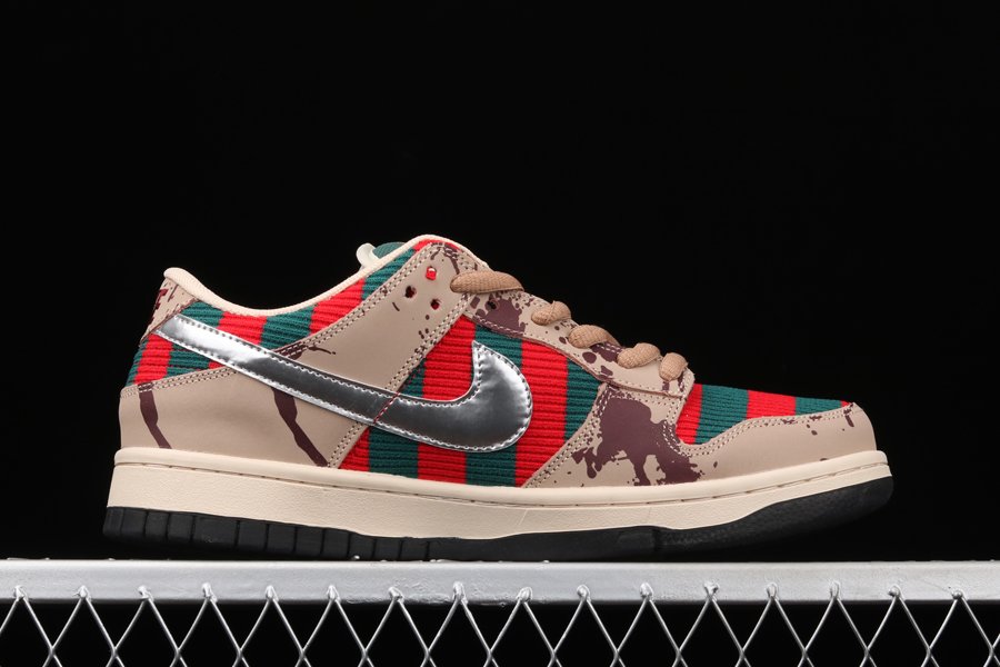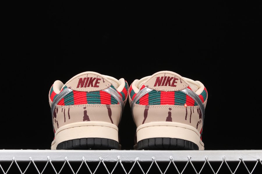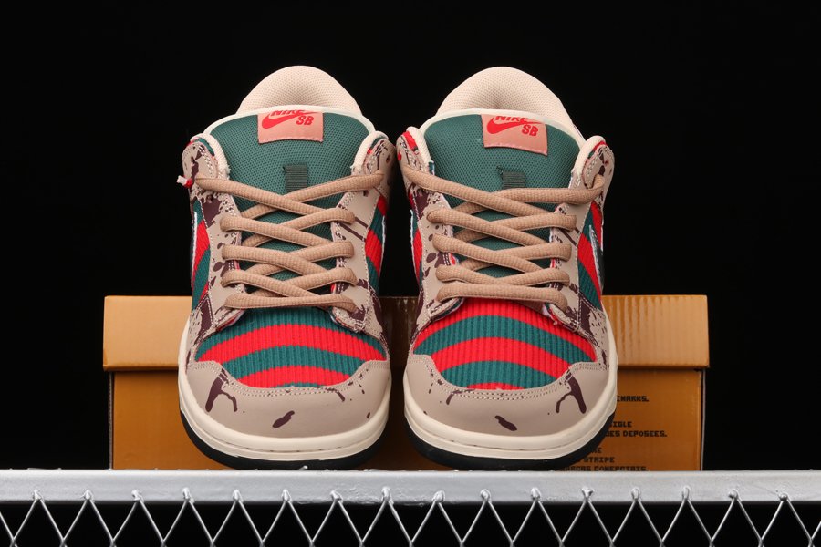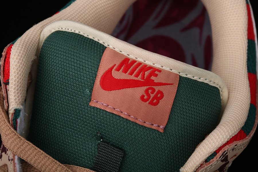 The Nike SB Dunk Low “Freddy Krueger” is one of the rarest sneakers from Nike SB of all time. The scary-good colorway inspired by the famous horror villain never received an official release, due to a cease and desist being issued to Nike by the creators of the “Nightmare on Elm Street” franchise. Only around 30 sample pairs of the “Freddy Krueger” Dunk are rumored to exist. What initially drew excitement to the SB line is the fact that many colorways were produced in limited quantities with hyped colorways, upgraded materials, and fun backstories. Perhaps no SB design embodies this sentiment more than the “Freddy Krueger” Dunk. Freddy’s signature sweater pattern of red and green stripes covers the upper, while tan leather overlays with blood splatters and a chrome Swoosh resemble his claws. The insole mirrors Freddy’s skin. Red embroidered Nike branding is featured on the heel with a tan midsole and black outsole completing the look.