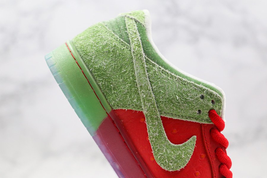 Designed in collaboration with the artist Todd Bratrud, the Nike Dunk Low SB ‘Strawberry Cough’ delivers a literal interpretation of the fragrant marijuana strain for which the shoe is named. The two-tone upper, resembling an actual strawberry through a blend of textured red leather and hairy green suede, rides on a semi-translucent rubber cupsole. A coughing anthropomorphic strawberry adorns both the sneaker’s lateral heel and custom sockliner.