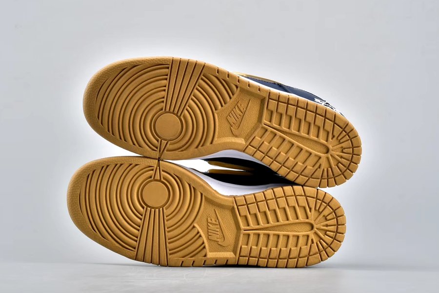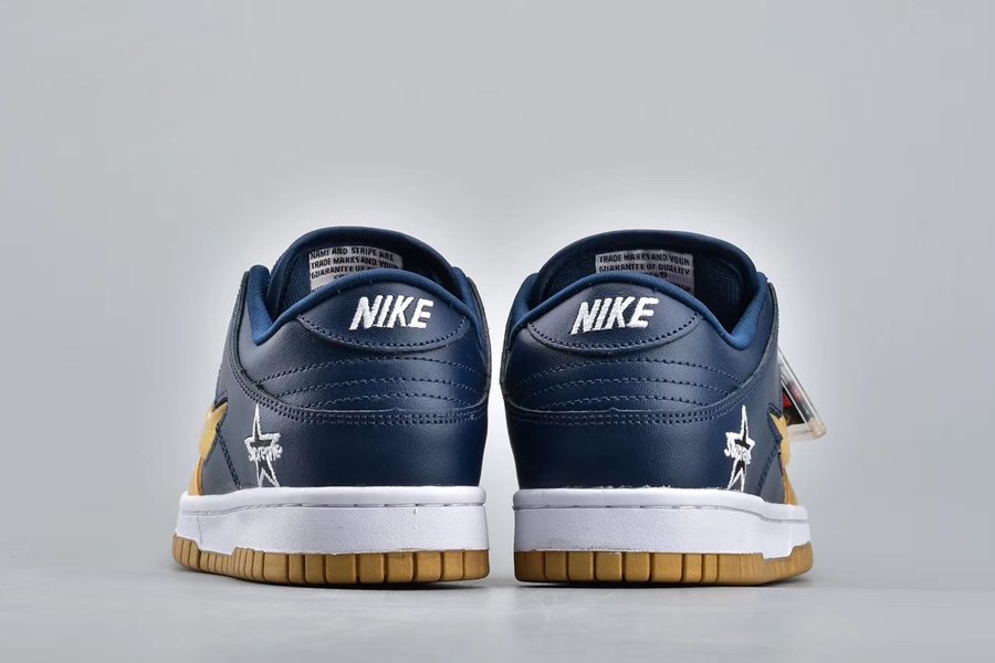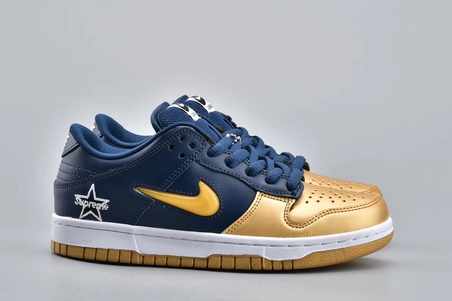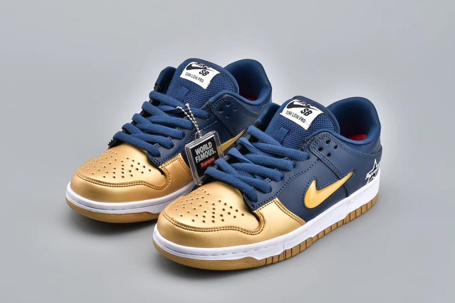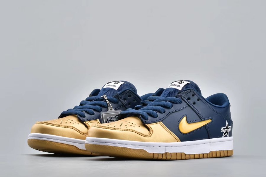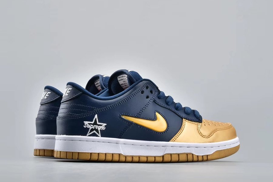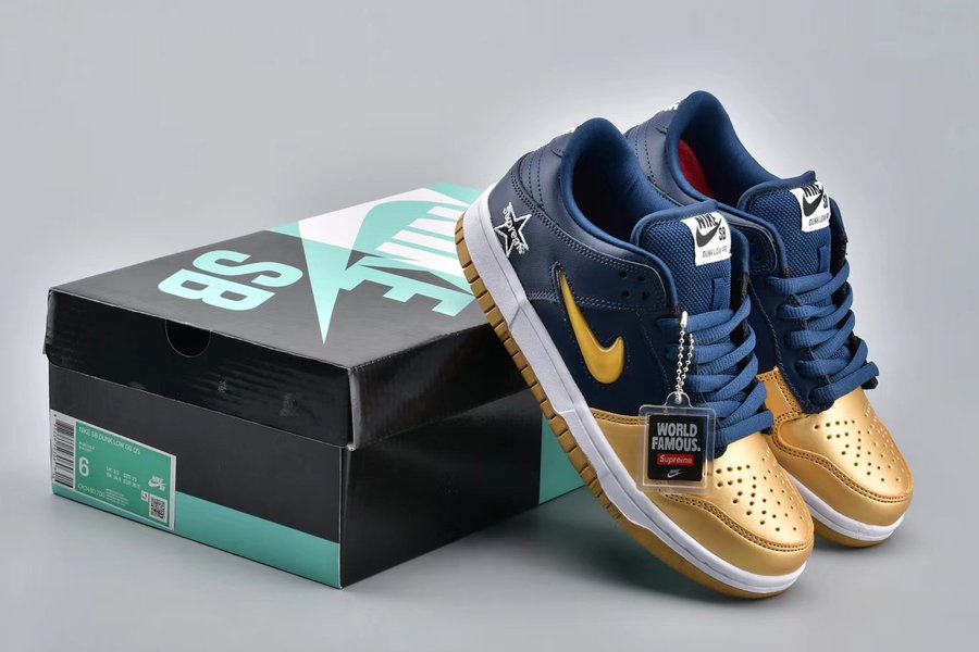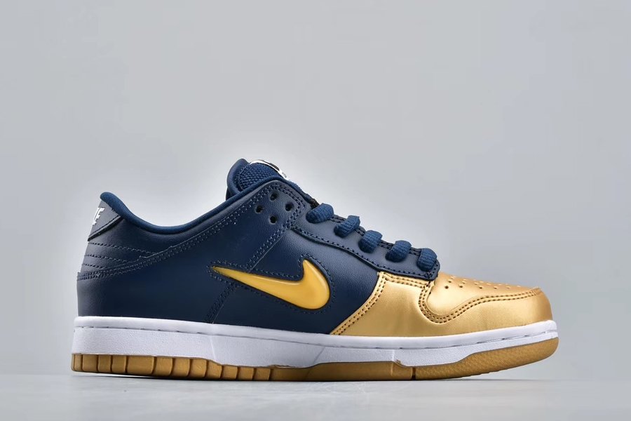 The Supreme x Nike Dunk SB Low “Jewel Swoosh Gold” is one of three unique colorways released in the fall 2019 collaboration between the world famous streetwear brand and Nike SB. The vision behind the collaborative pack comes from two-toned, half-metallic color blocking found on a set of mid-to-late ’90s era Nike Air Force 1 Mids that featured jewel Swoosh detailing. The upper features a navy blue leather base with a metallic gold perforated toes. Further design aspects that conjure nostalgic memories of ’90s sports and streetwear include a metallic gold jeweled Swoosh on the mid-panel and a Supreme star logo embroidered on the heel. Nike branding is found on the tongue tab and embroidered in white on the heel. Completing the look is a white rubber midsole and gold outsole.