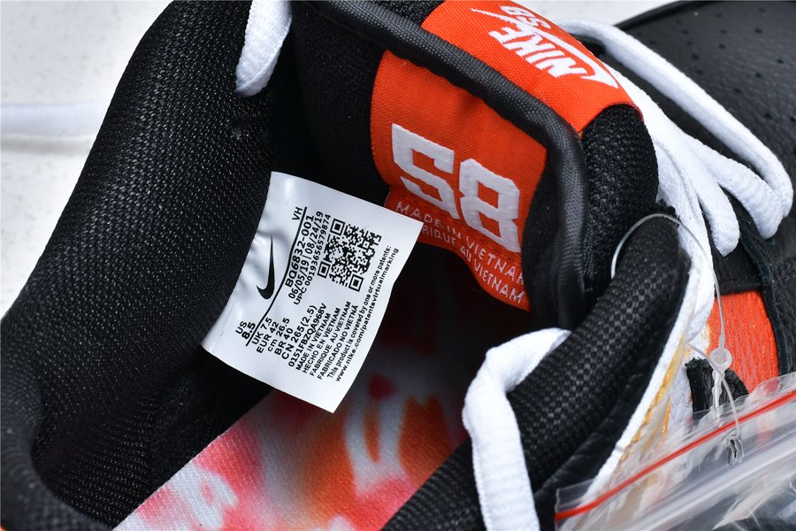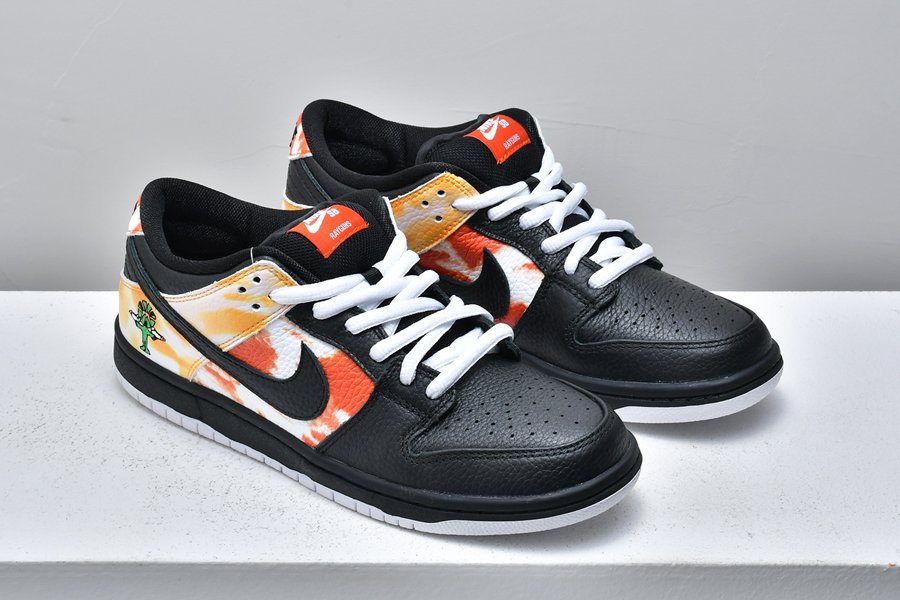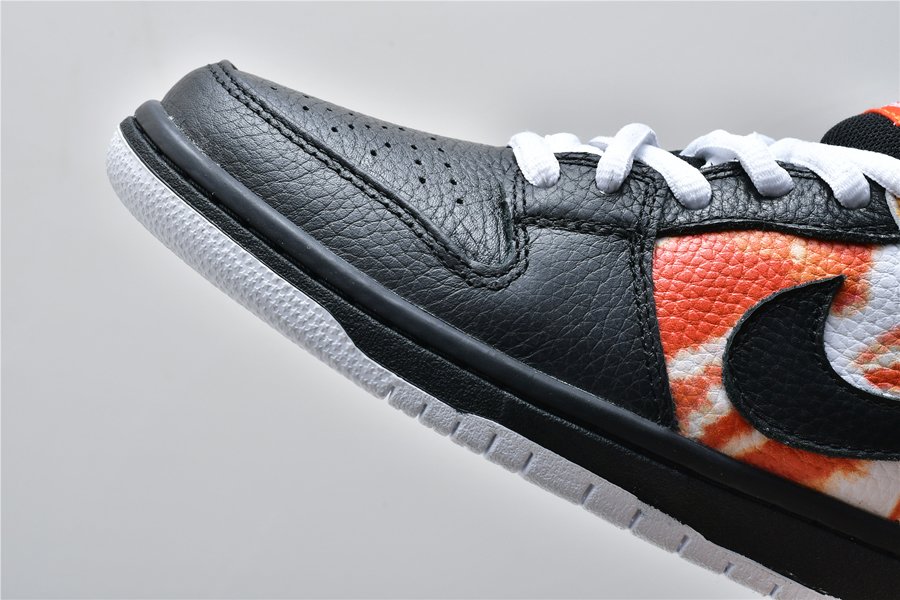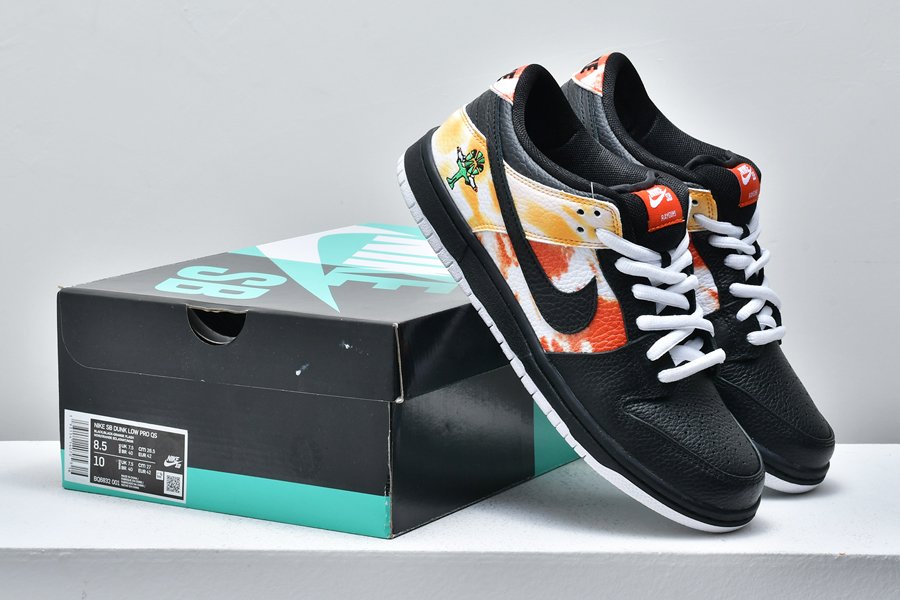 This Nike SB Dunk Low features a black tumbled leather on the front half of the shoe with a white, orange, and yellow tie-dye pattern hitting the side panels and heel. Additional details include Nike SB Rayguns tongue tags, tie-dye heels with black Nike branding, black leather Swooshes, white laces, a black midsole, and a white rubber outsole. The signature “Raygun” logo embroidered on the heels completes the design.