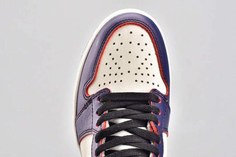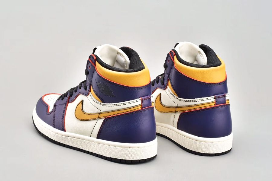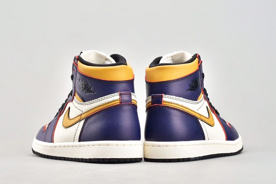 This Nike SB X Jordan 1 comes dressed in a Los Angeles Lakers color scheme and they feature a White leather base, with Purple leather overlays which turns Red with wear, and Yellow accents including the Nike SWoosh. Finished off with a White midsole and a Black rubber outsole.