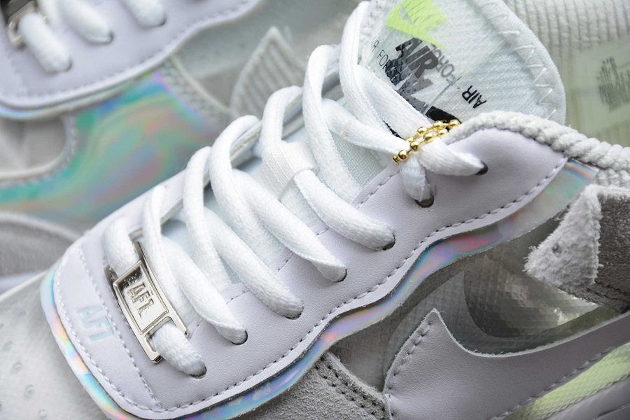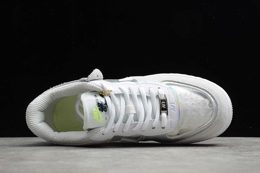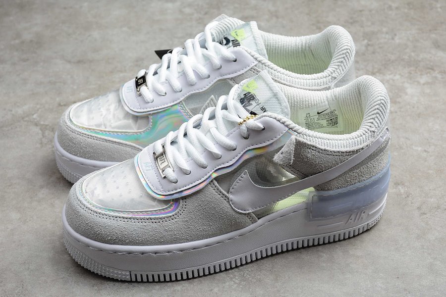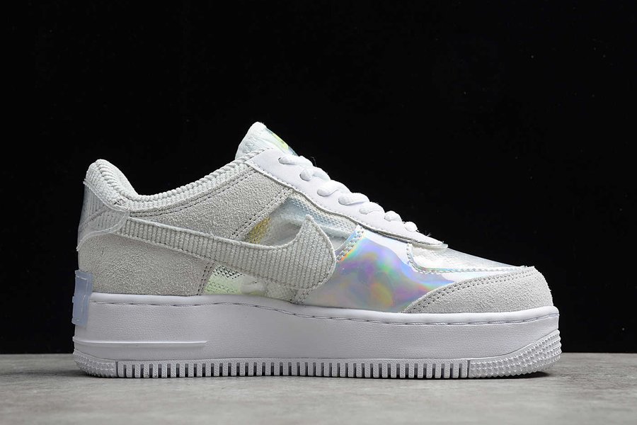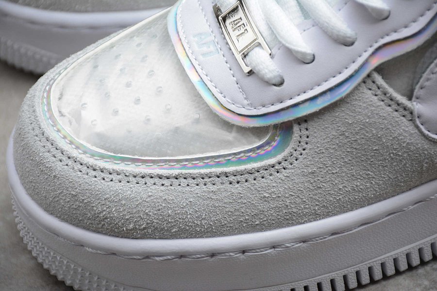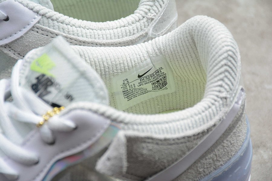 This new version of the women’s-exclusive Air Force 1 model comes dressed in a Pure platinum, White, and Metallic Silver color scheme. Making it stand out from previous colorways of the silhouette are the transparent toes, side panels and tongue label. Need more distinct features? Peep the iridescent trim and overlays. Rounding out the main features of the shoe are the Platinum suede overlays, corduroy medial Swooshes and inner lining atop a White rubber sole.