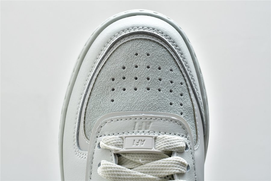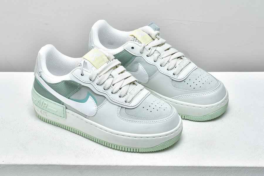 Taking on various shades of green throughout the upper, this Nike WMNS Air Force 1 Shadow combines Spruce Aura and Pistachio Frost on the upper which has been constructed out of smooth leather, pebbled leather, mesh and suede. The unique details of this Air Force 1 are still present, including double Swooshes, the double layered midsole, eyestay, and heel tabs.