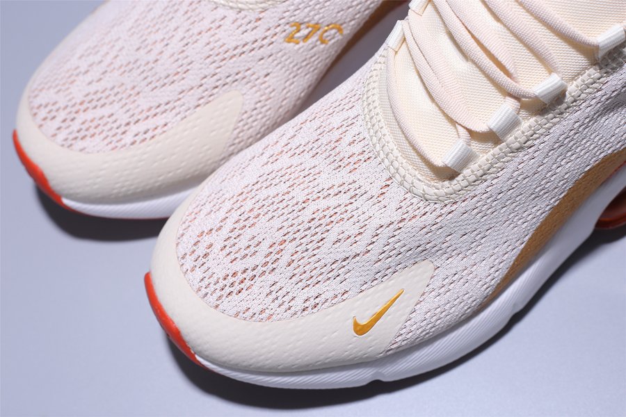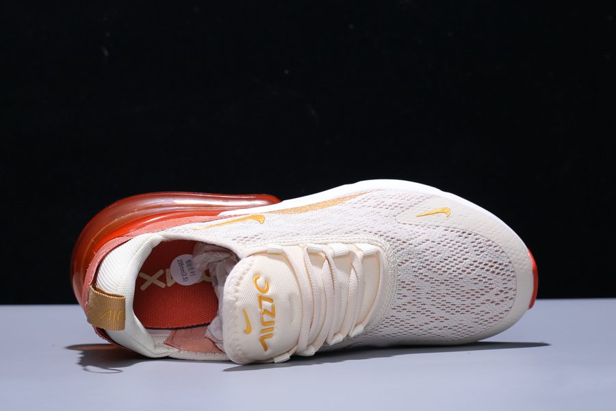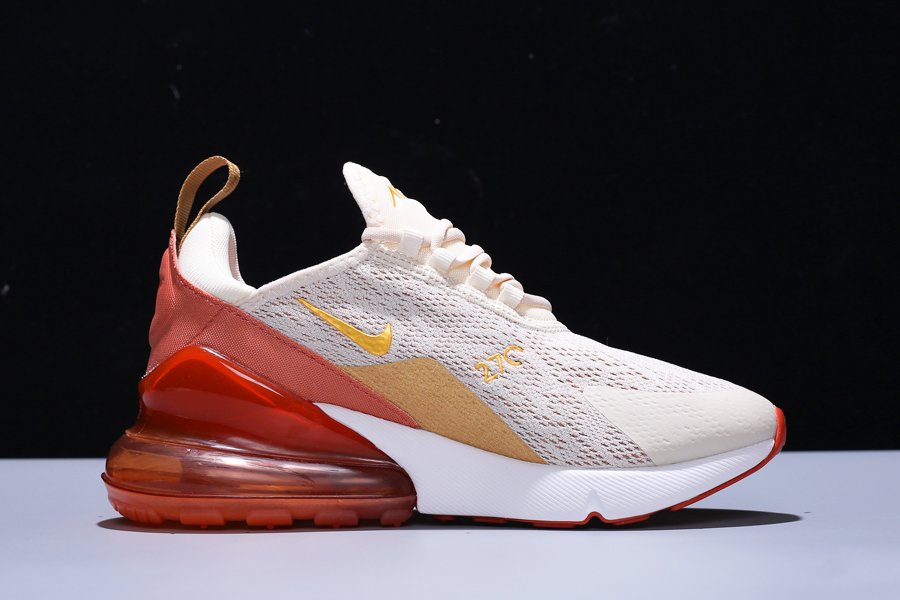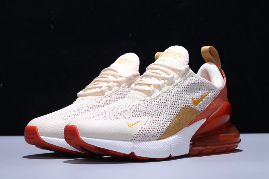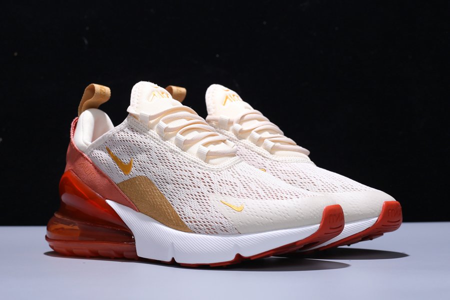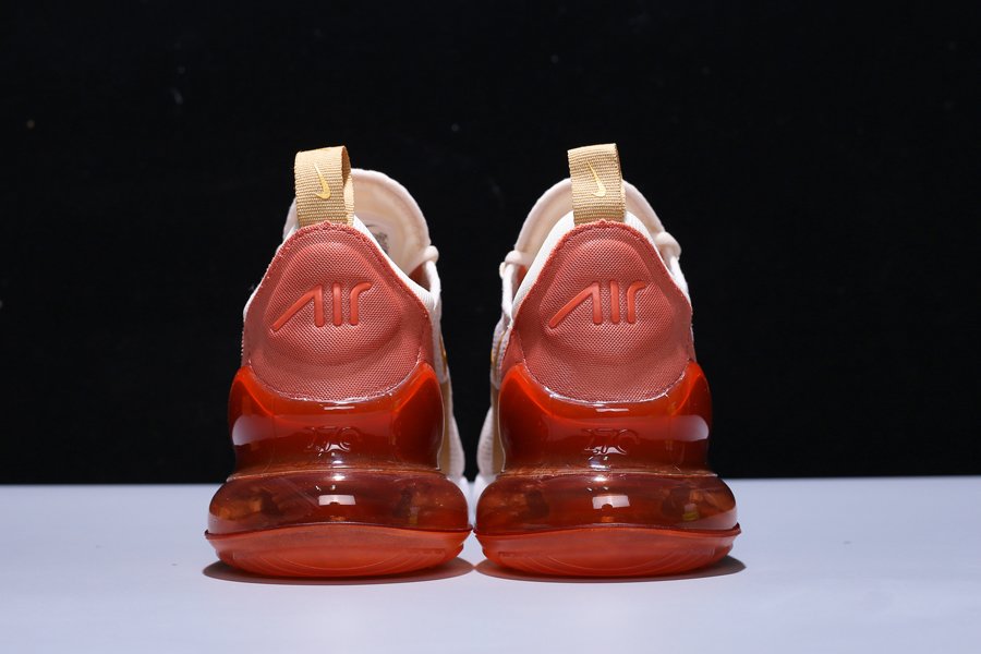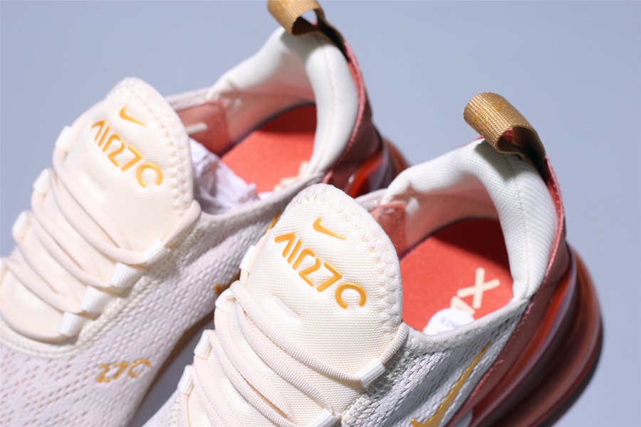 This Nike Air Max 270 women’s style impresses us all with a perfect combination of light cream and metallic gold. Translated into a sneaker that’ll elevate any outfit, the lifestyle shoe is constructed of a tan-shaded, patterned mesh upper that’s paired with a terra blush pink layer on the heel. Metallic gold accents hit the miniature Swooshes, heel tab, and midfoot detail. The chunky midsole is split between white foam and a translucent terra blush pink Air cushioning bubble, and the outsole coordinates with the Air Max unit.