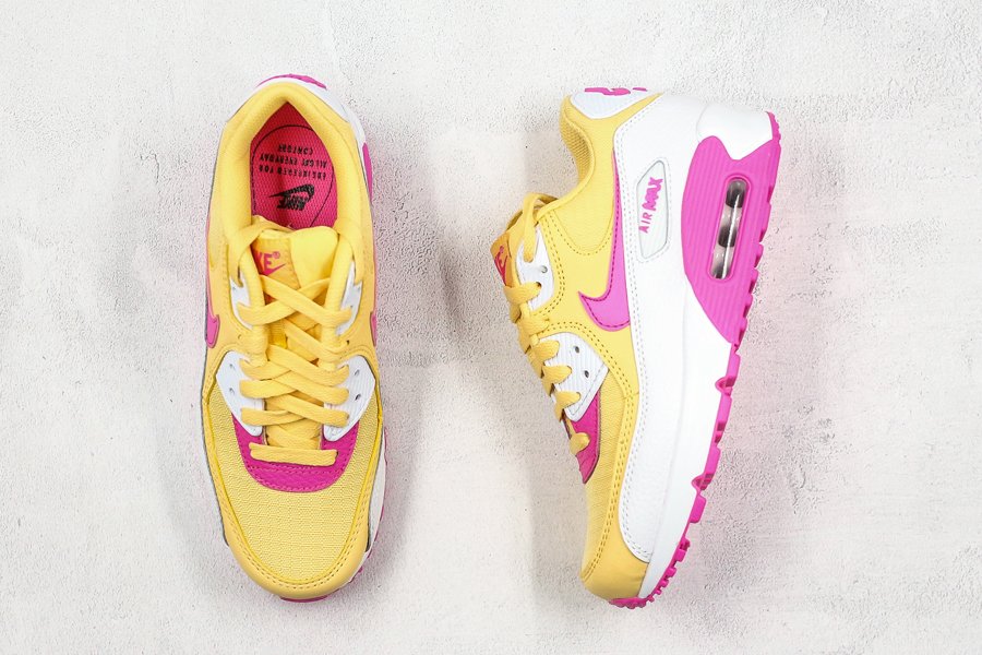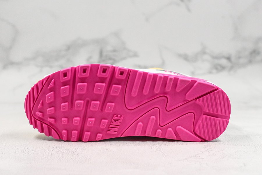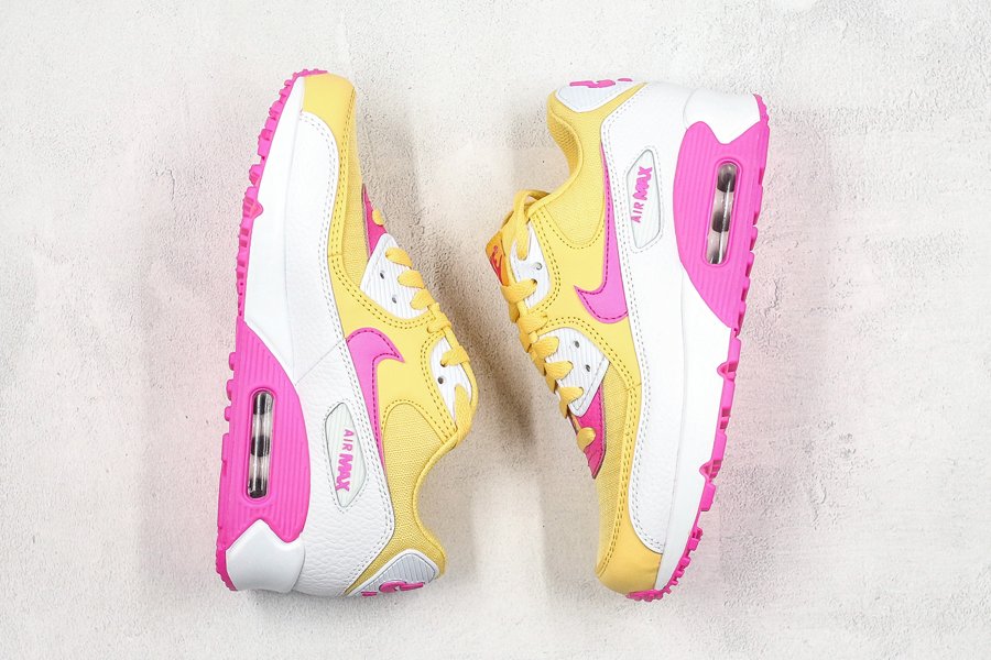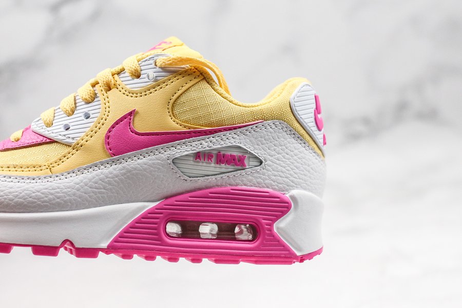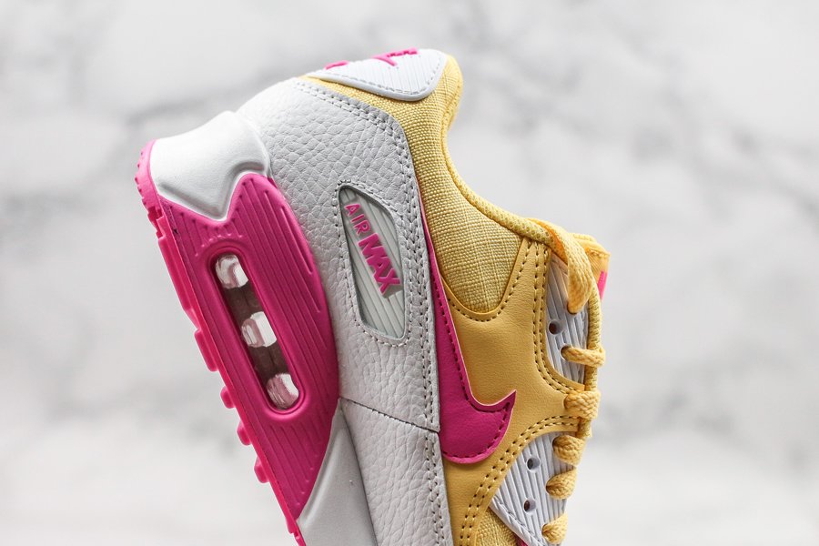 This Nike Air Max 90 comes dressed in a Topaz Gold, White and Laser Fuchsia color combination. Highlighted with Topaz Gold mesh while leather lands on the overlays. In addition White is used on the mudguard, heel and most of the midsole. Completing the look is Pink accents on the upper and covering the rubber outsole.