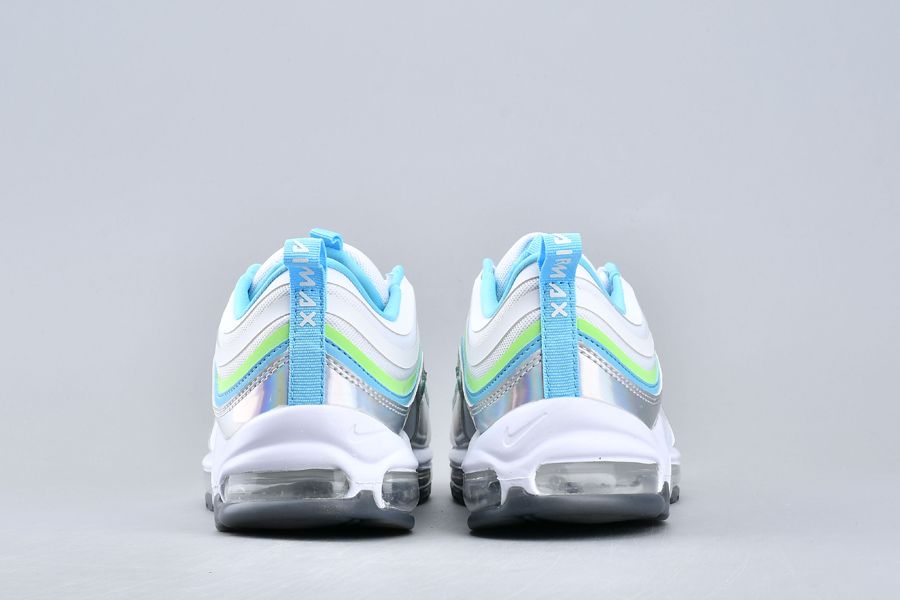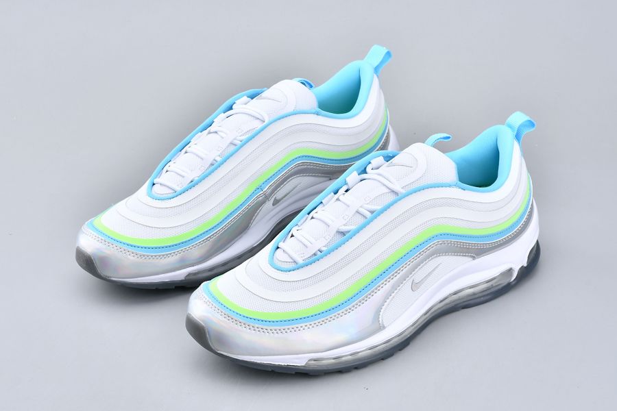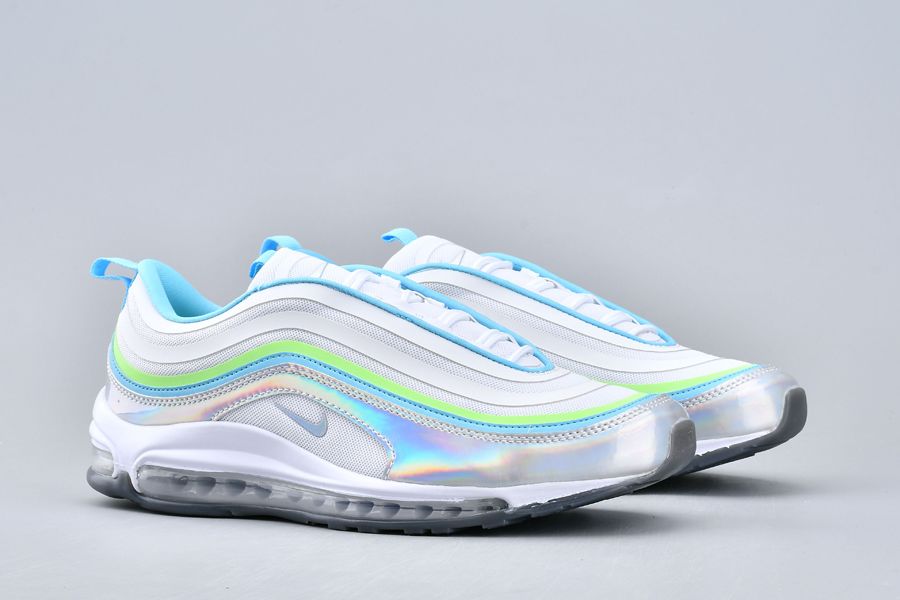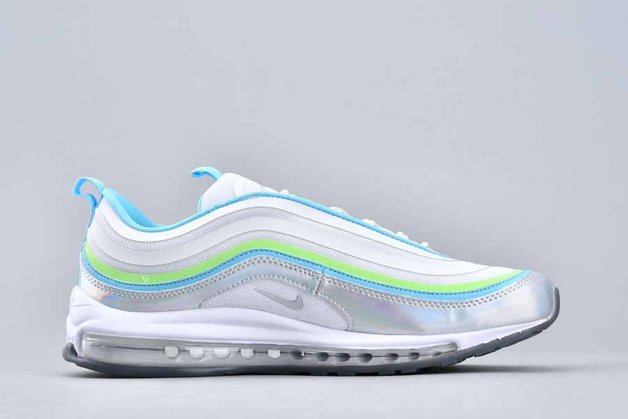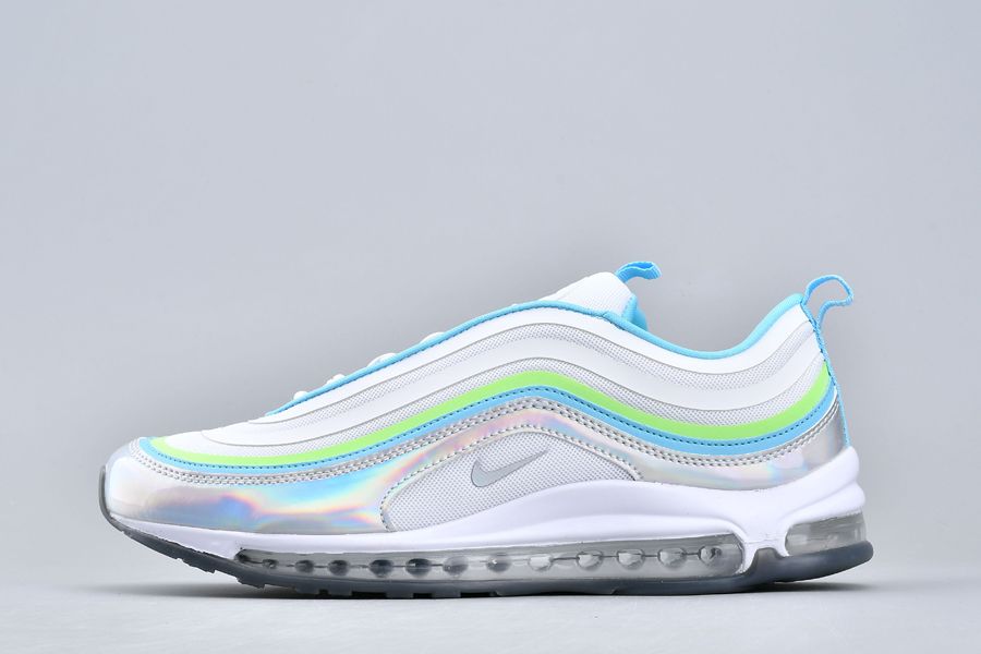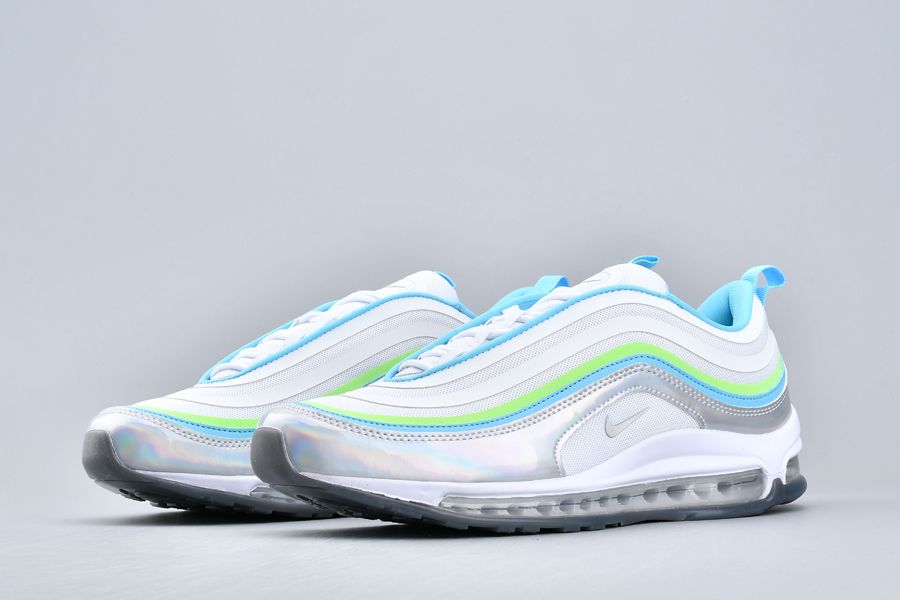 A new-and-improved version the original AM97, Nike showed off the women’s Air Max 97 Ultra 17 with this special edition ’Iridescent’ colorway in December 2018. The design’s wavy upper features blue and green taped tracks in place of traditional embroidery as well as a pearlized mudguard wrap. The shimmering upper sits atop a matching midsole with a full-length visible Max Air unit and black rubber outsole.