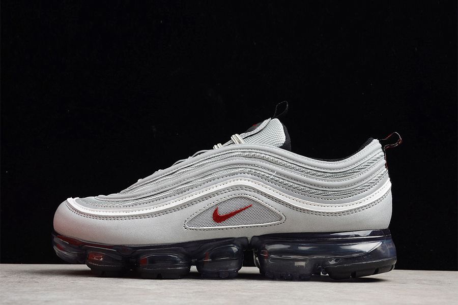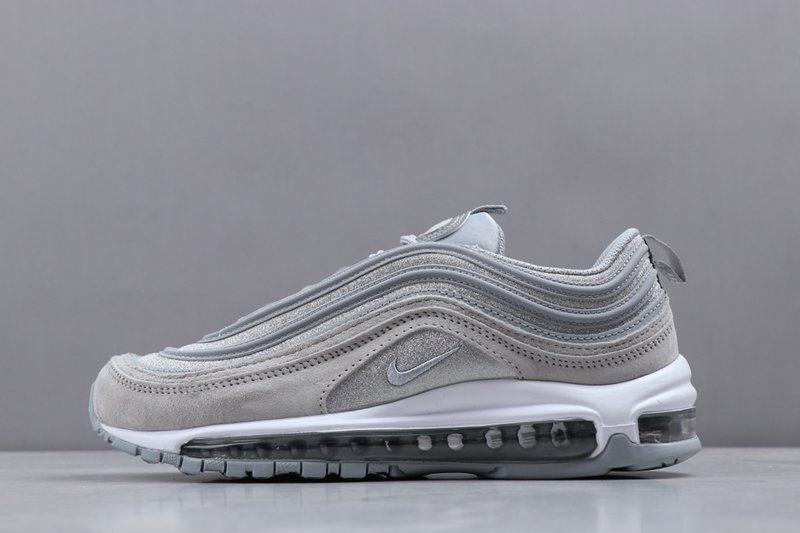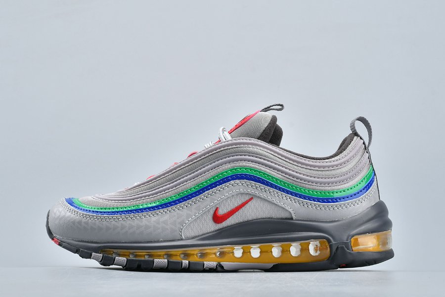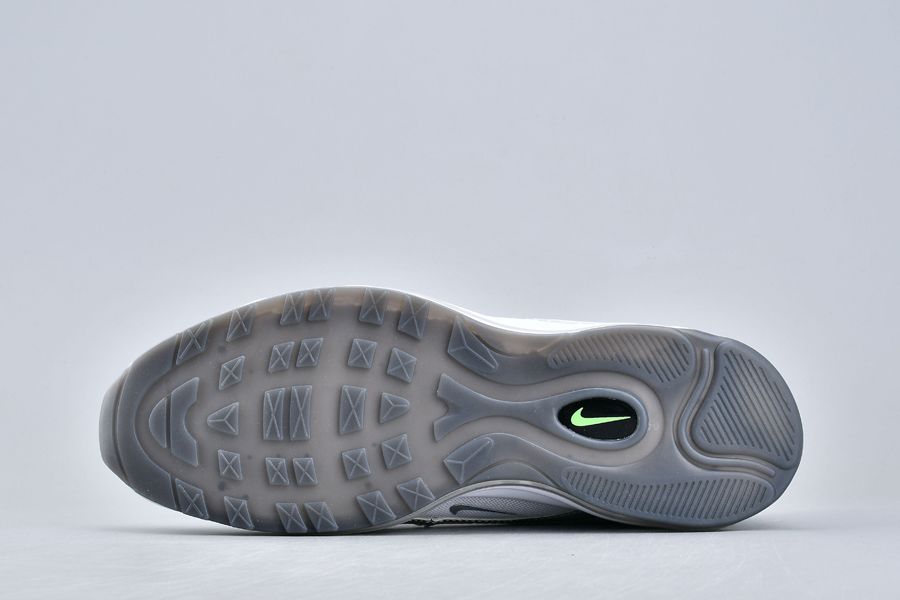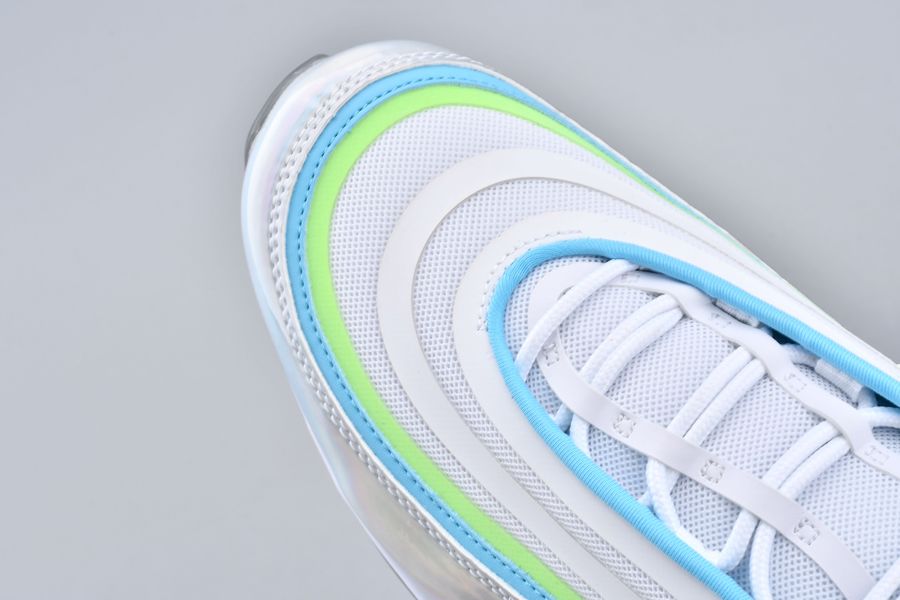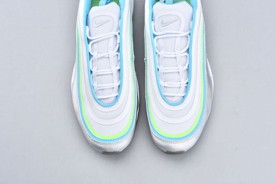 A new-and-improved version the original AM97, Nike showed off the women’s Air Max 97 Ultra 17 with this special edition ’Iridescent’ colorway in December 2018. The design’s wavy upper features blue and green taped tracks in place of traditional embroidery as well as a pearlized mudguard wrap. The shimmering upper sits atop a matching midsole with a full-length visible Max Air unit and black rubber outsole.