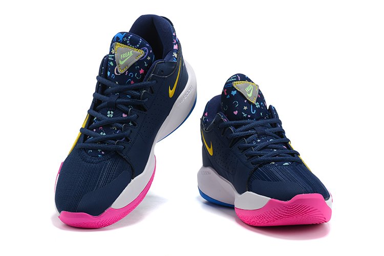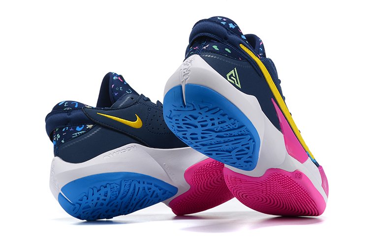 This Nike Zoom Freak 2 features a Midnight Navy, Poison Green, and Fire Pink color combination. First, we have Navy across the uppers while constructed with woven on the lateral and leather on the medial. Furthermore, Gold covers the Swoosh logo on the panels with illustrations like an umbrella, ladders, cats, and other graphics. Those same graphics adorn the tongue and heel, but in shades of Blue, Green, Pink, and Orange. Green then hits the tongue branding and Giannis’ logo by the heel. Finally, White on the midsole while Pink and Blue cover the outsole finishes the look.