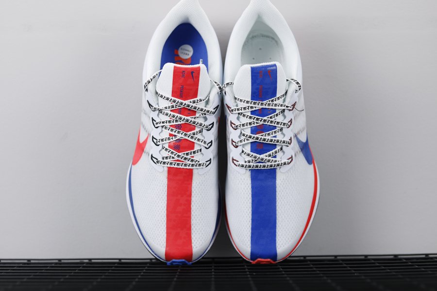 This Nike Zoom Pegasus 35 Turbo features a White mesh upper while Orange and Blue accents lands on the sides. The left shoe features Blue Nike Swoosh logos, Blue stripe on the tongue and an Orange insole. The right shoe has a reverse design. Completing the look we have ‘Shanghai’ across the laces done in Black Chinese characters.