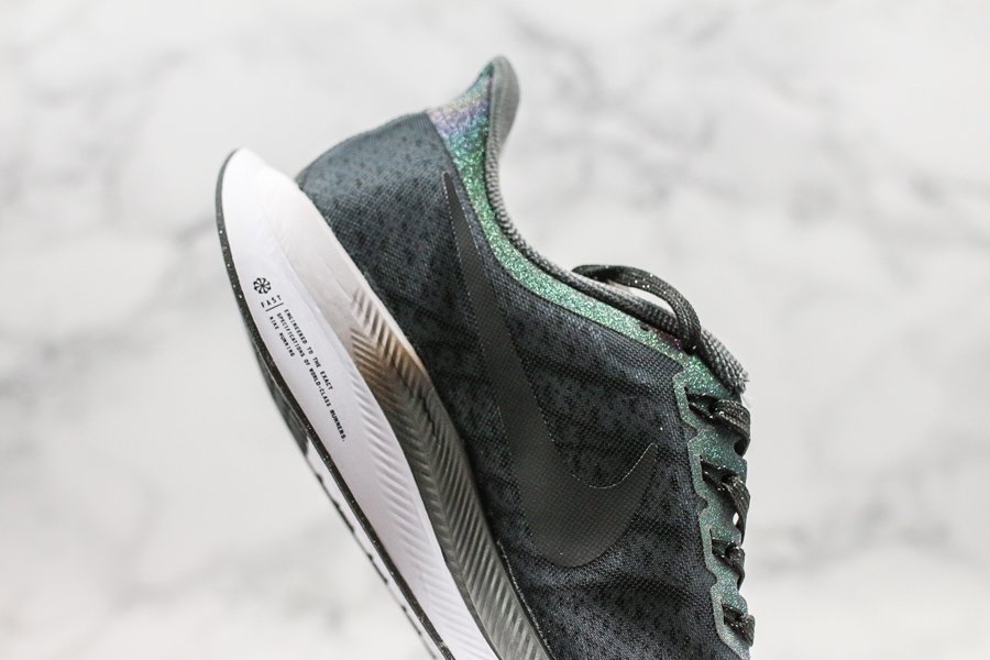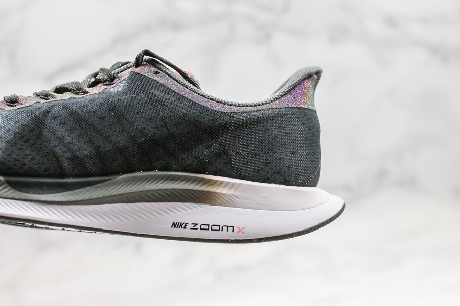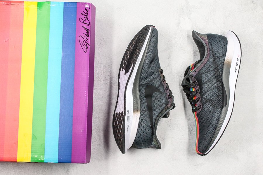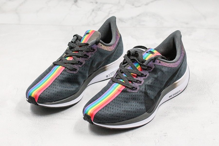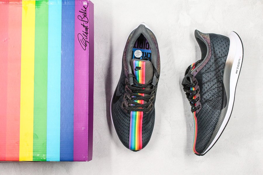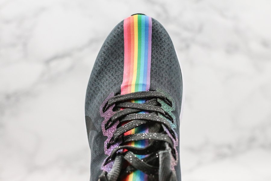 Painted in a dark navy hue, the usual racing stripe has been replaced with Gilbert Baker’s iconic rainbow flag motif that shoots vertically across the entire upper. A massive Swoosh logo shoots down the lateral and medial side panels, and down below, a ZoomX midsole and aerodynamic heel makes these some of the most streamlined trainers that you can buy. Like the React Element 87, the Zoom Pegasus Turbo Be True is infused with React foam cushioning for comfort like nothing else, so it’ll feel like you’re walking on a plump cloud while you march on with pride.