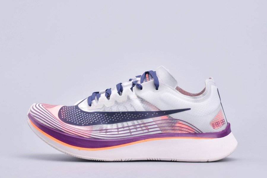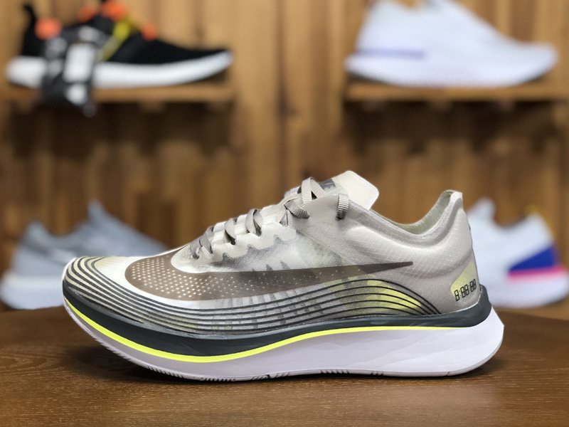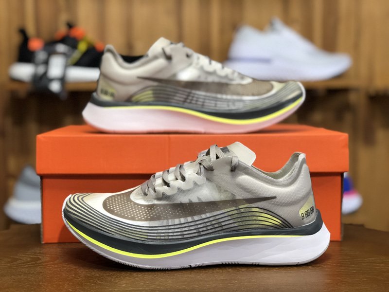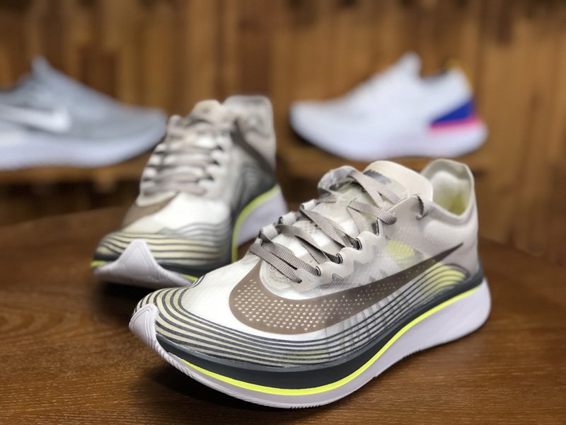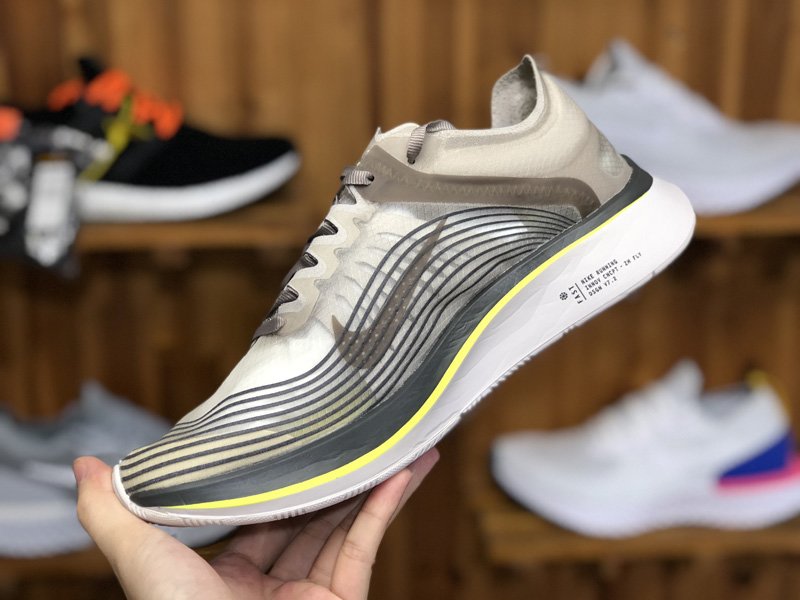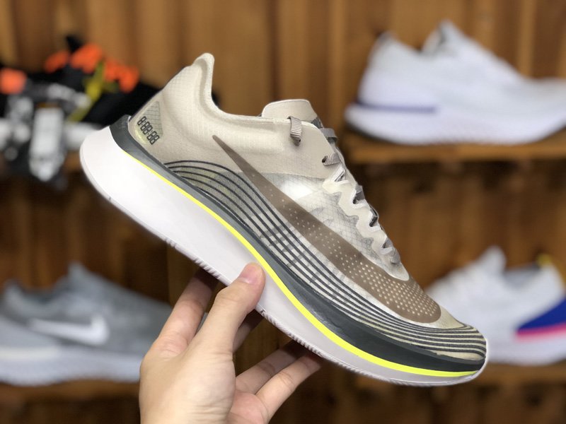 Nike Zoom Fly sneaker is back with a new color scheme. The runner presents a “Sepia Stone” theme combining various shades of brown along its translucent upper in addition to yellow piping that separates it from a white Lunarlon sole unit. A full-length carbon-infused nylon plate provides a feel that propels your run while remaining responsive throughout.