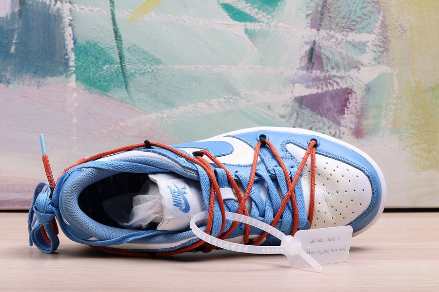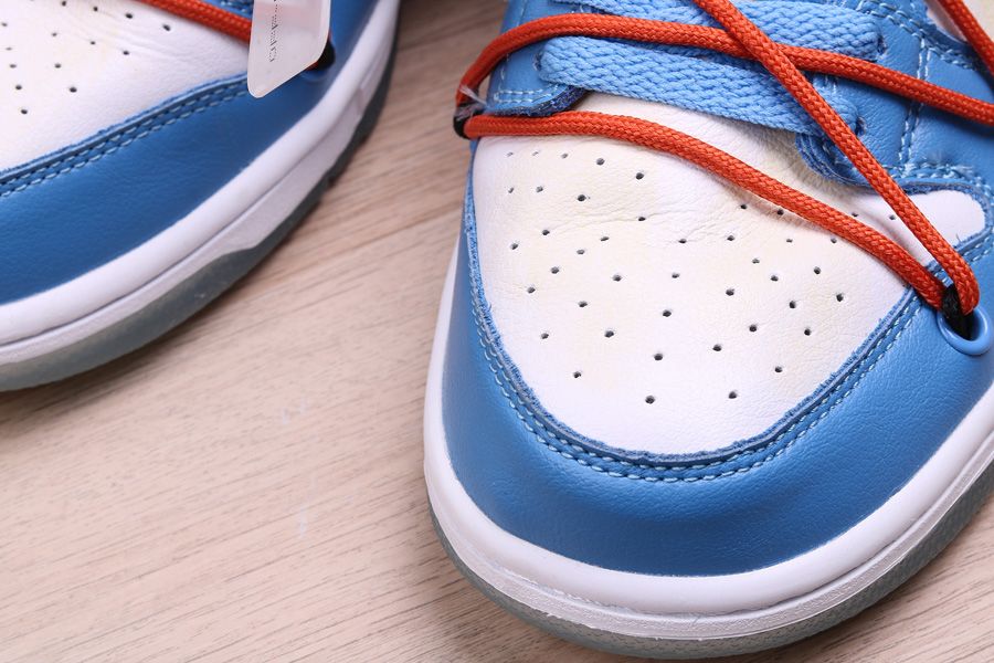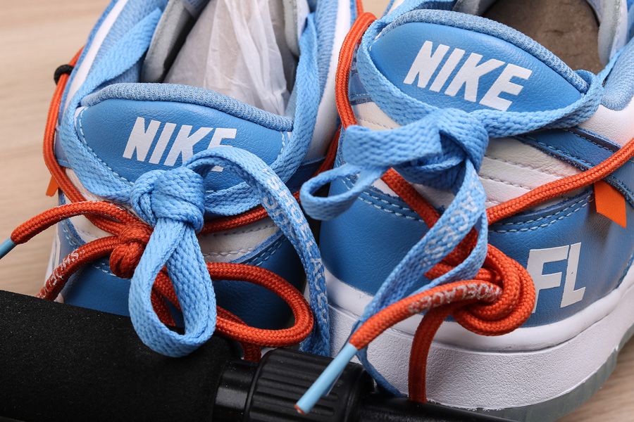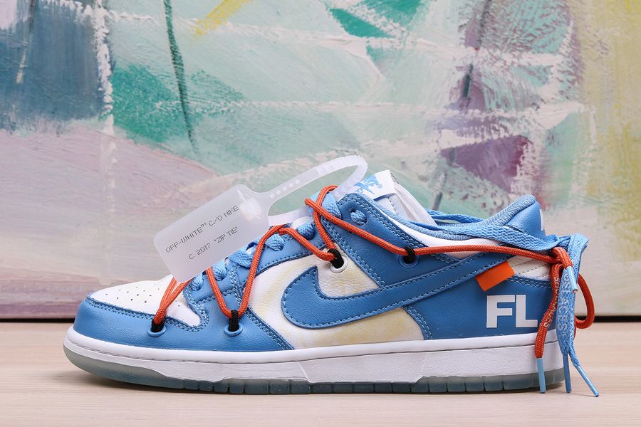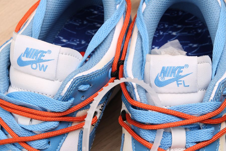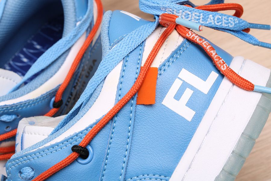 This Off-White x Futura x Nike Dunk Low is dressed in a UNC color scheme with Bright Orange laces. Details on the pair include the signature Off-White branding stamp on the side panel, the “SHOELACES” text on the laces, and most notable the new unique lacing system that extends on to the toe cap and collar of the shoe. Below you will find a translucent outsole with Futura’s signature, while “FL” branding is spotted on the lateral heel.
