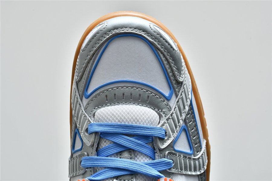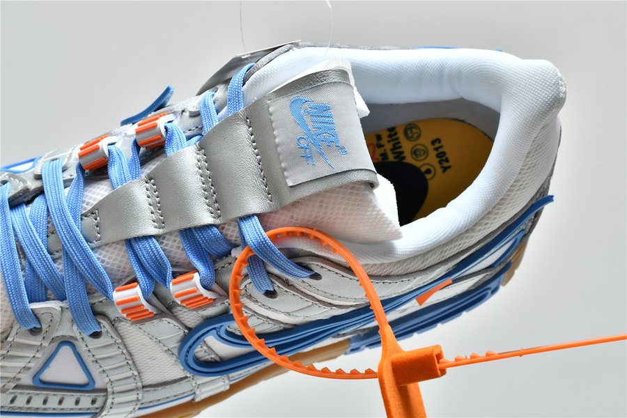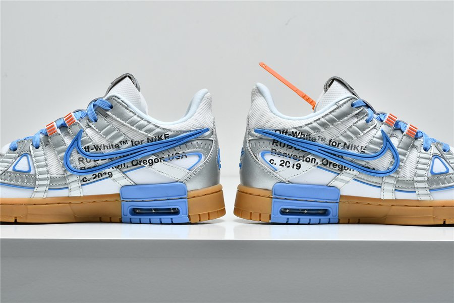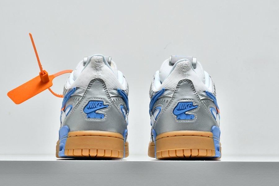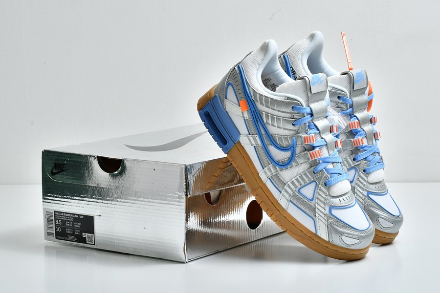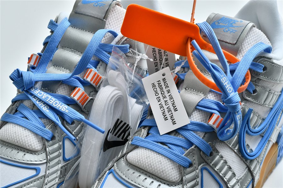 The hybrid model is defined by maximalist metallic silver overlays, blue rubber framing and matching midfoot Swooshes. Additional detailing comes in the form of Nike Air branding at the rear, “NIKE OFF” tongue tags, Helvetica industrial text printing on the medial midfoot, tacked on orange tabs and printed insoles. Elevating the shoe is a gum rubber sole unit with a contrasting blue visible Air unit at the heel.