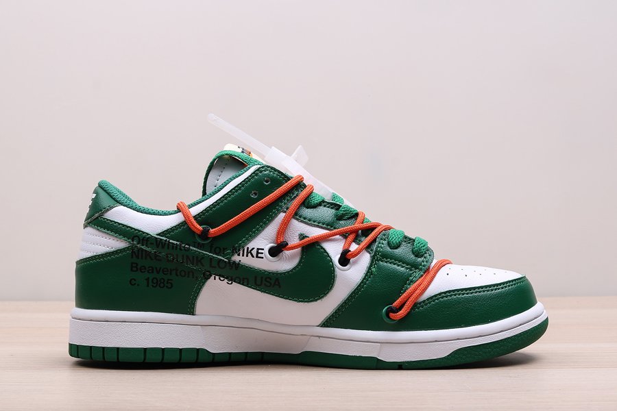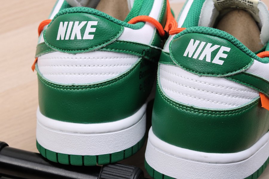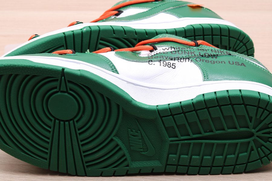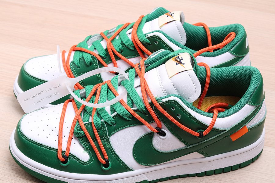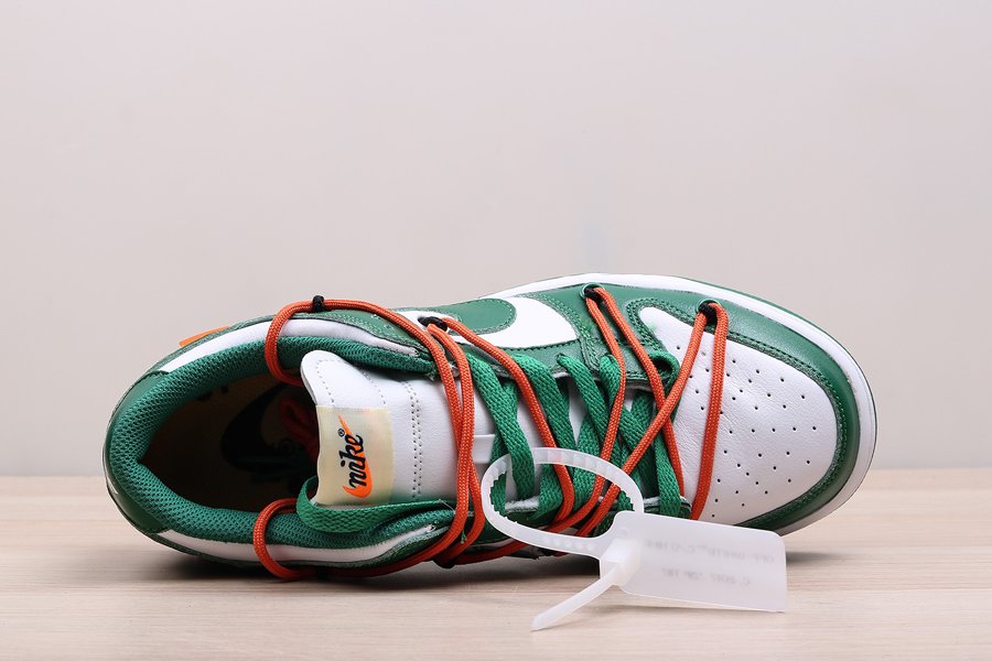 Now, we can’t talk about the Off-White x Nike Dunk Low Pine Green without mentioning its unique lacing system. A design feature that has never been done before on this silhouette, it makes use of two pairs of laces that criss cross each other. One pair is the traditional flat style, while the other bears a striking resemblance to those used on hiking boots, resulting in an ultra unique aesthetic that you don’t see every day.