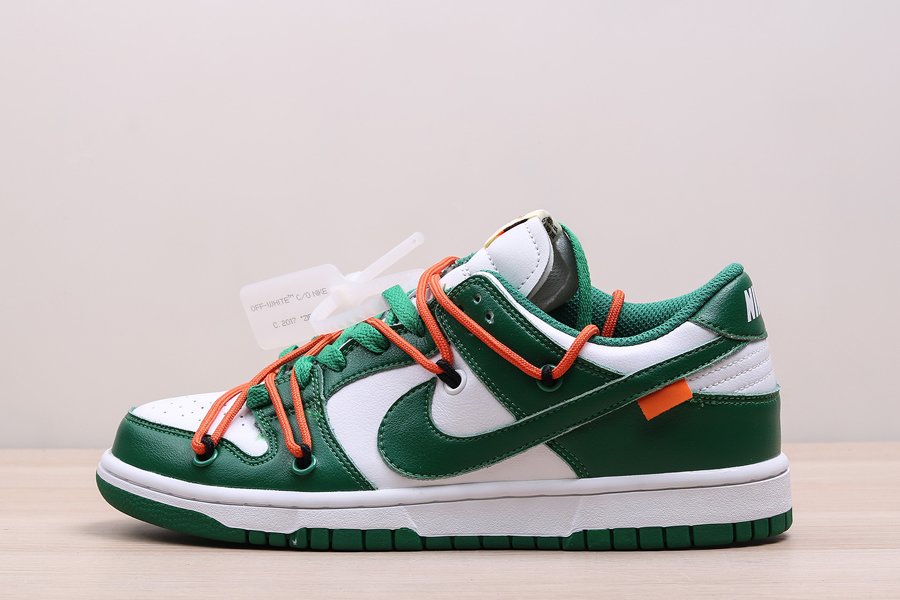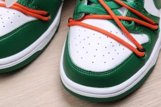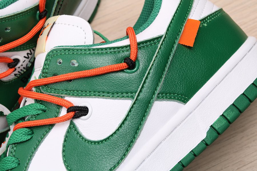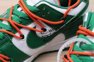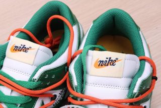 Now, we can’t talk about the Off-White x Nike Dunk Low Pine Green without mentioning its unique lacing system. A design feature that has never been done before on this silhouette, it makes use of two pairs of laces that criss cross each other. One pair is the traditional flat style, while the other bears a striking resemblance to those used on hiking boots, resulting in an ultra unique aesthetic that you don’t see every day.