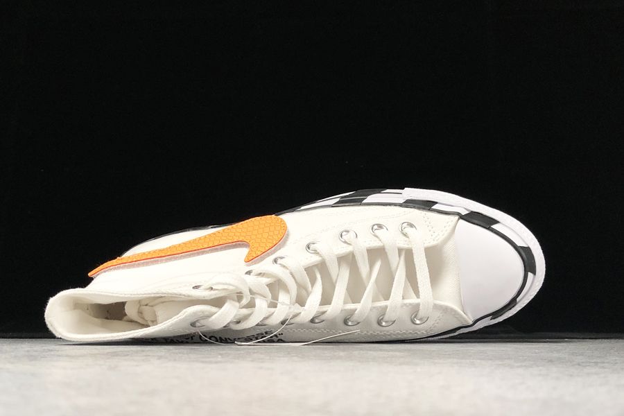 Boasting a more pared-down aesthetic compared to the first iteration that we saw earlier this year, the Off-White x Converse Chuck 70 Stripe White comes dressed in a clean white canvas complete with a bold orange outsole and zip tie. Off-White’s signature verbiage hits the side, and down below, a black and white rubber midsole can be seen, resembling Virgil Abloh’s iconic striped motif.