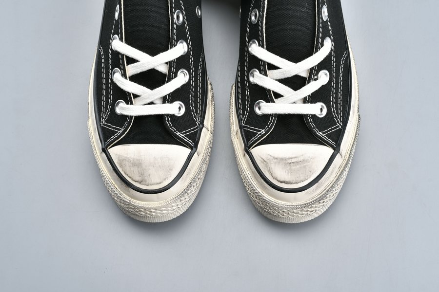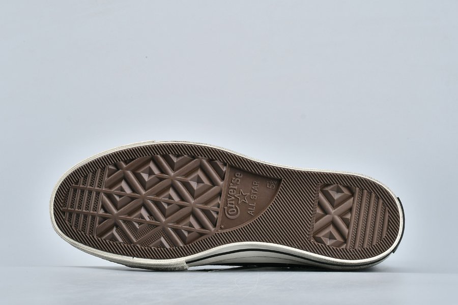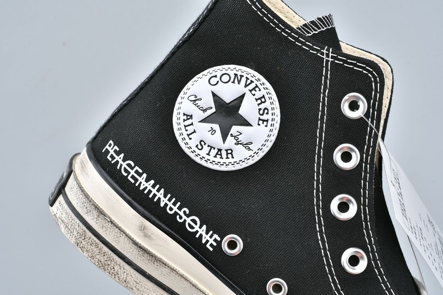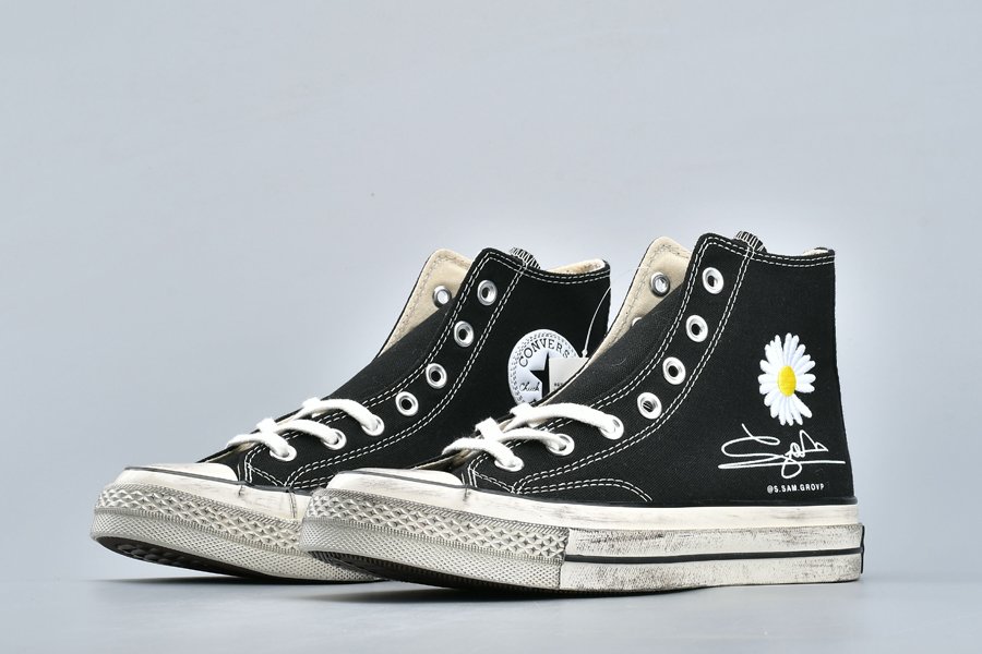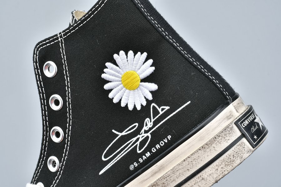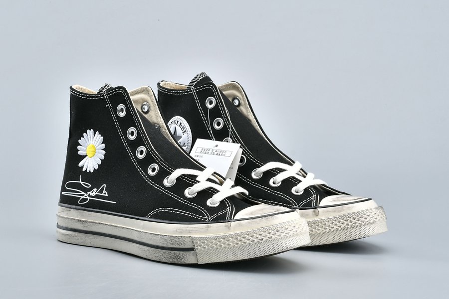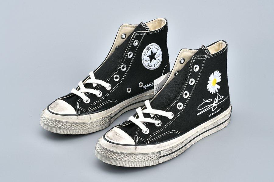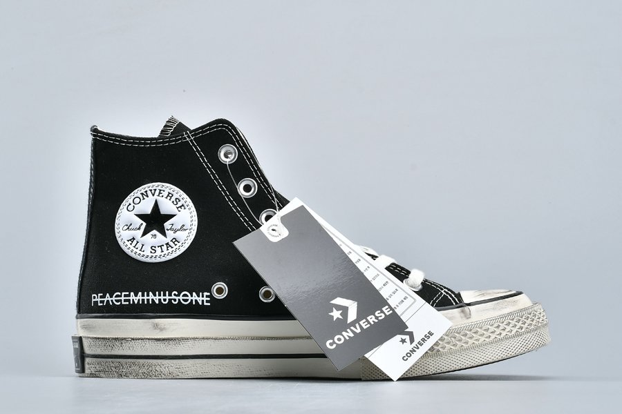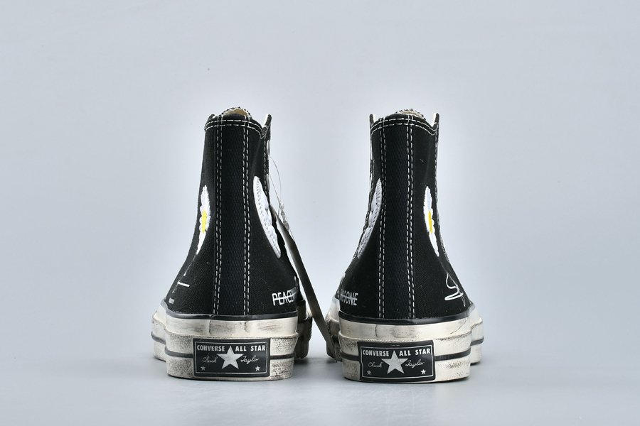 The Converse Chucks Taylor sport a black textile upper with the label’s signature sunflower motif embroidered on the heel, while the rubber sole has been treated with a worn-out aesthetic. Finishing details include the “PEACEMINUSONE” branding with a standard strikethrough on the lower heel of the outer lateral section, followed by Converse’s classic patch.