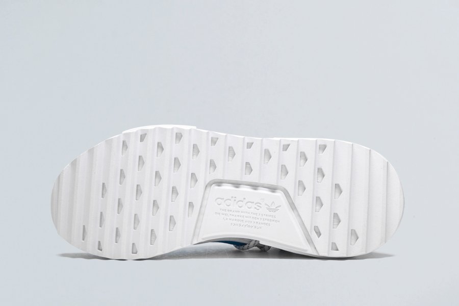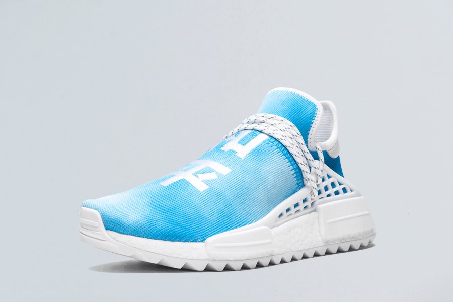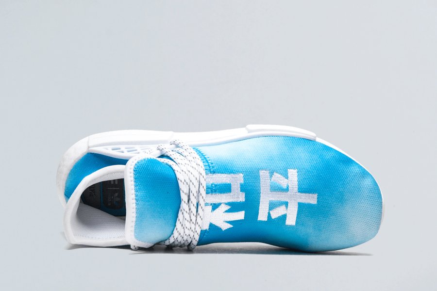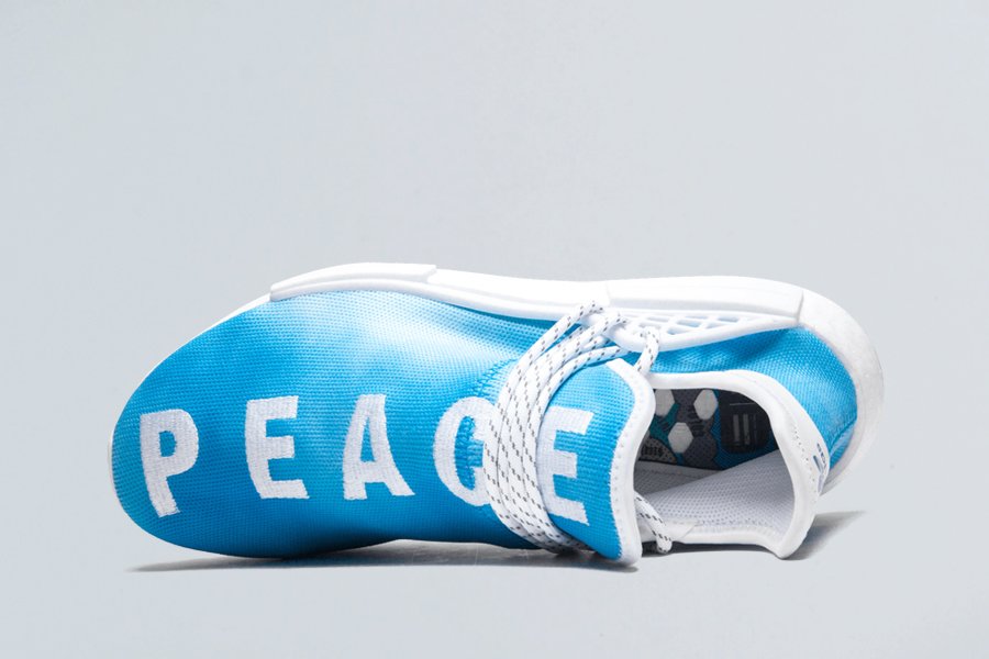 A set of white speckled laces continues the theme on the Pharrell Williams NMD Hu China PEACE Blue. Under the foot sits a clean BOOST midsole. Which Promises the best lightweight cushioning ever made by the three stripe brand. The tonal EVA plugs make it even more robust. They also hold the lace holes that create a unique foot experience. Lastly comes is a chunkier than ever before newly engineered trail outsole that completes the design.