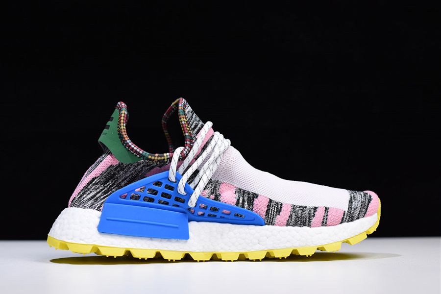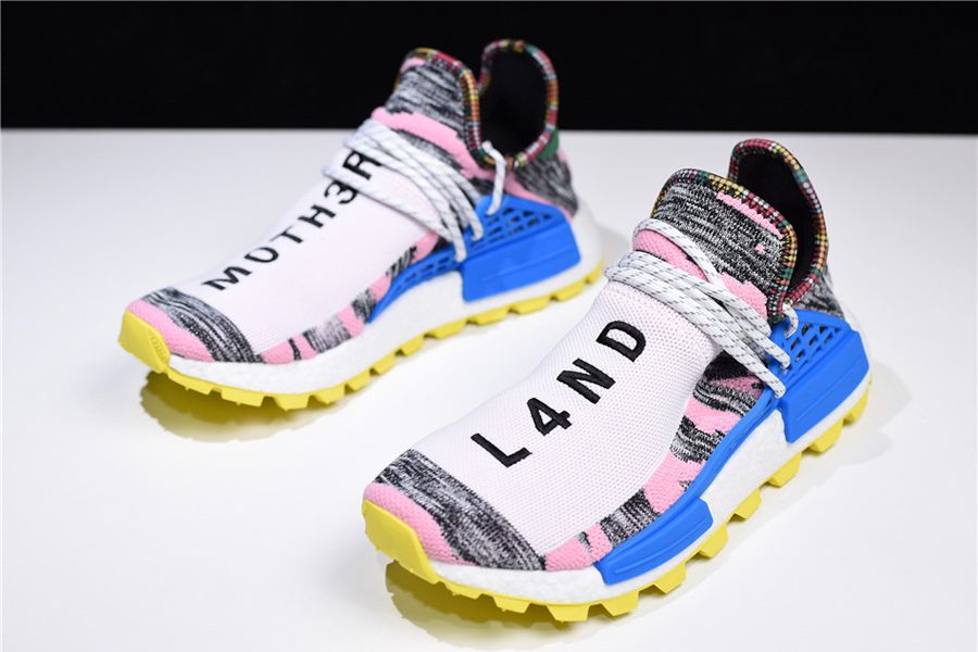 Following the colorful tribal aesthetic found on the ”3MPOW3R” and “M1L3L3” iterations, the additional look features a pink base upper accented by haphazard black/white marbled stripes and choice ”MOTH3R” vamp embroidery. Additionally, the blue, yellow, and green lining, light blue lace cage, trail laces and midfoot bumpers match the busy look of the upper. Rounding up the design of the shoe is a full-length BOOST midsole and bright yellow rubber outsole which provide a rugged cushioned ride.