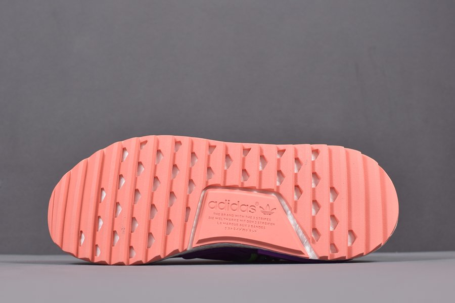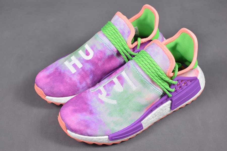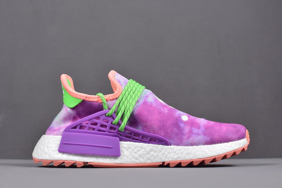 The Pharrell x adidas NMD Hu Trail “Holi” features a coral pink, sky blue and purple tie-dye prime knit upper with green and purple accents along the cage and laces. While boost is kept white, the rubber trail outsole is dressed in coral pink.