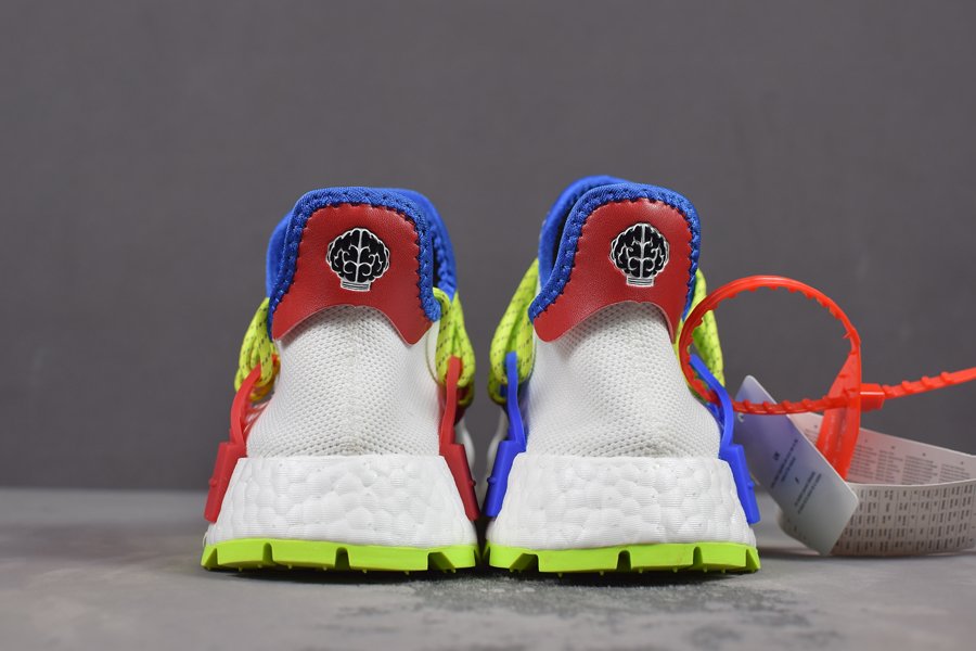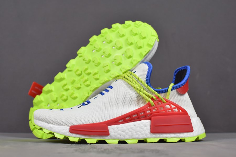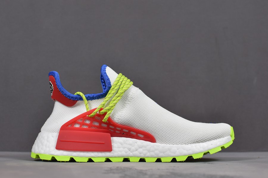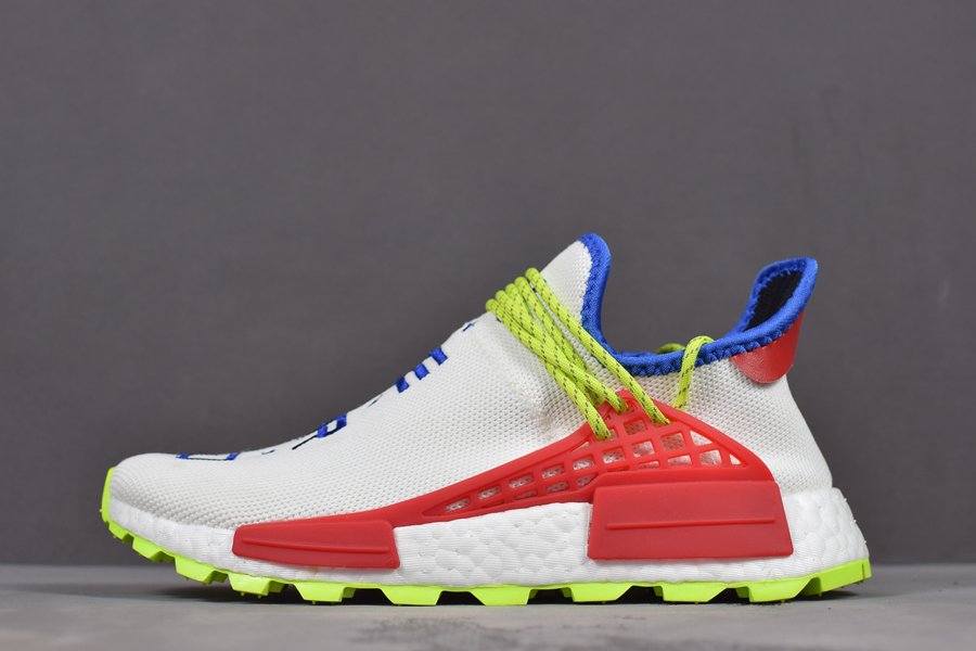 Pharrell Williams created another highly sought-after edition of the adidas NMD Hu Trail. The sneakers were available only at the Z104 Shaggfest music festival on June 16, 2018 in Pharrell’s hometown of Virginia Beach. Nicknamed “Homecoming,” the colorway features a vibrant look. The white mesh on the upper is accented with blue, red, and neon yellow and N.E.R.D. branding.