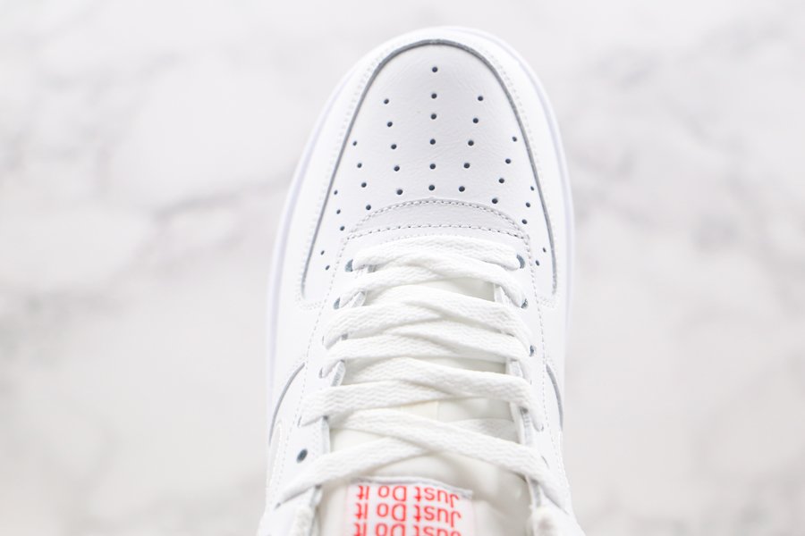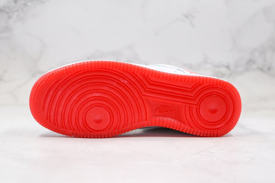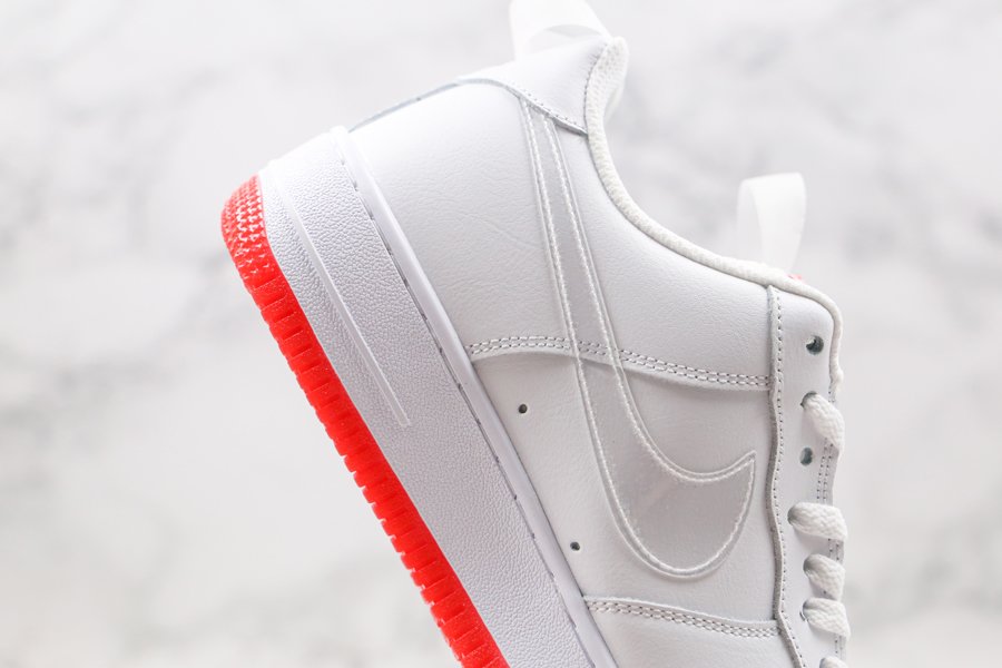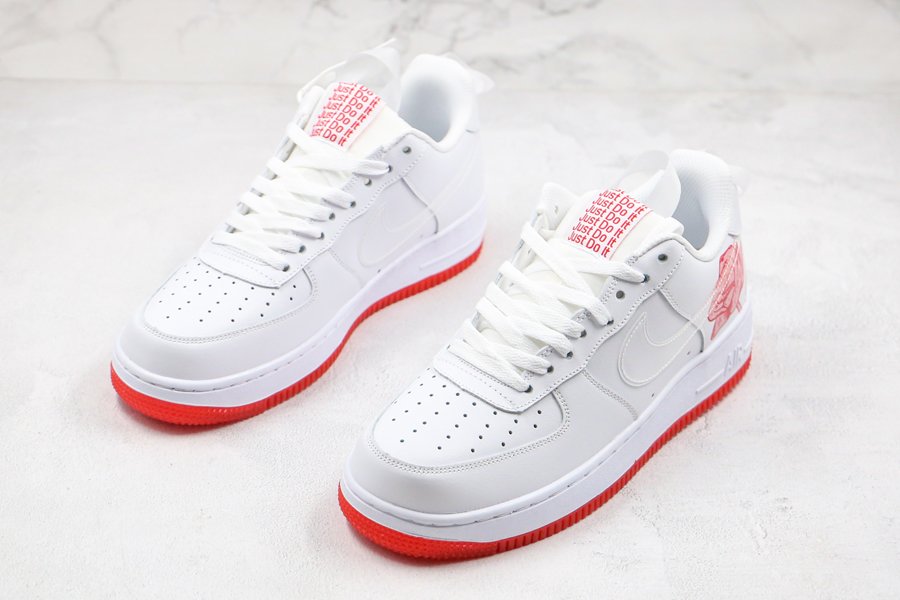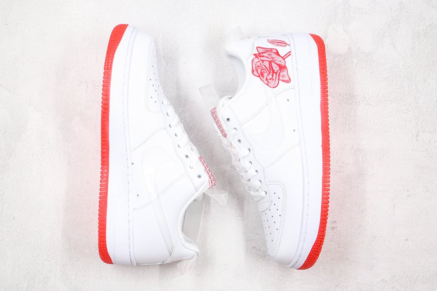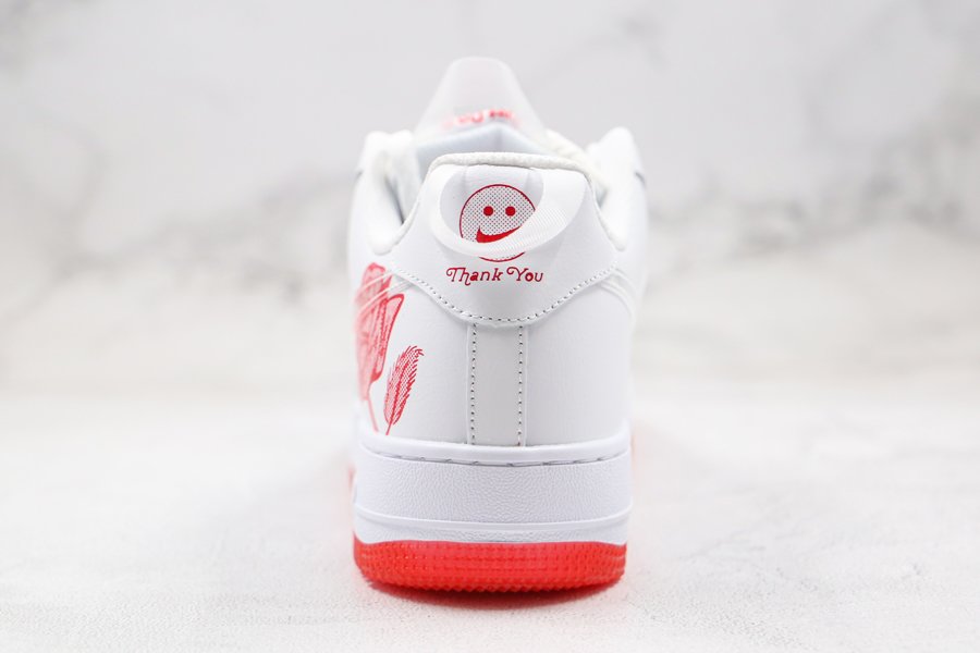 Done in a White/White/University Red color scheme, this Nike Air Force 1 Low starts off with a White leather base, which is the highlighted by the red rose noted on the lateral side of the heel. Additional unique details on the shoe include the transparent Swooshes, pull tabs on the heels and tongues, with the ones on the tongues reading “Just Do It” and the heels featuring a smiley face and “Thank You” wording, A White midsole and a Red translucent outsole completes the look.