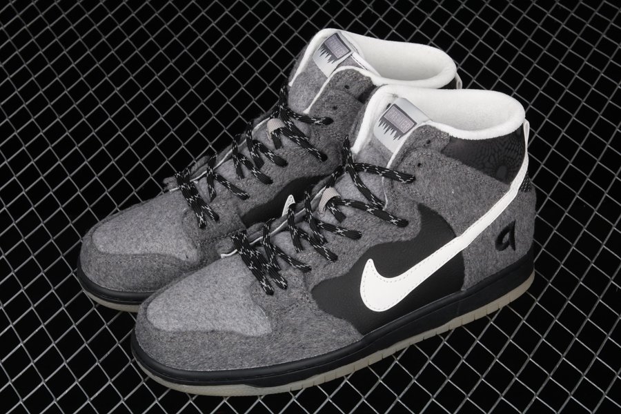The “Petoskey” Premier x Nike SB Dunk High comes in a Dark Charcoal wool upper and incorporates leather accents with a reflective graphic print across the back panel. More details include a “P” on embroidered on the heel, Premier branding on the tongue tags, and insoles. Finishing off the ill design are icy translucent soles, and a White Swoosh.