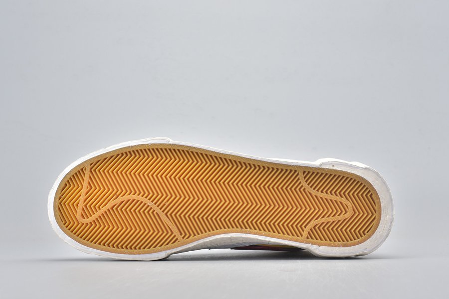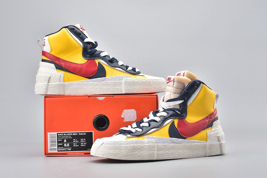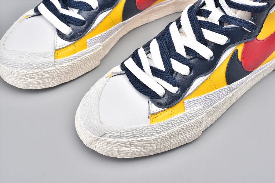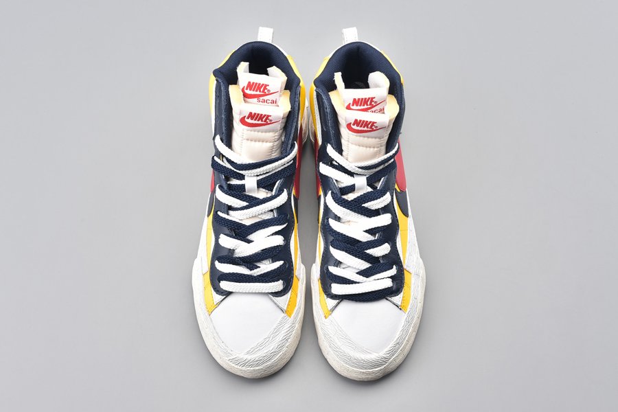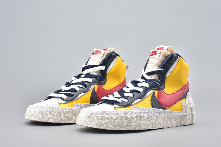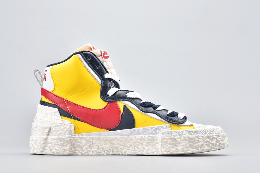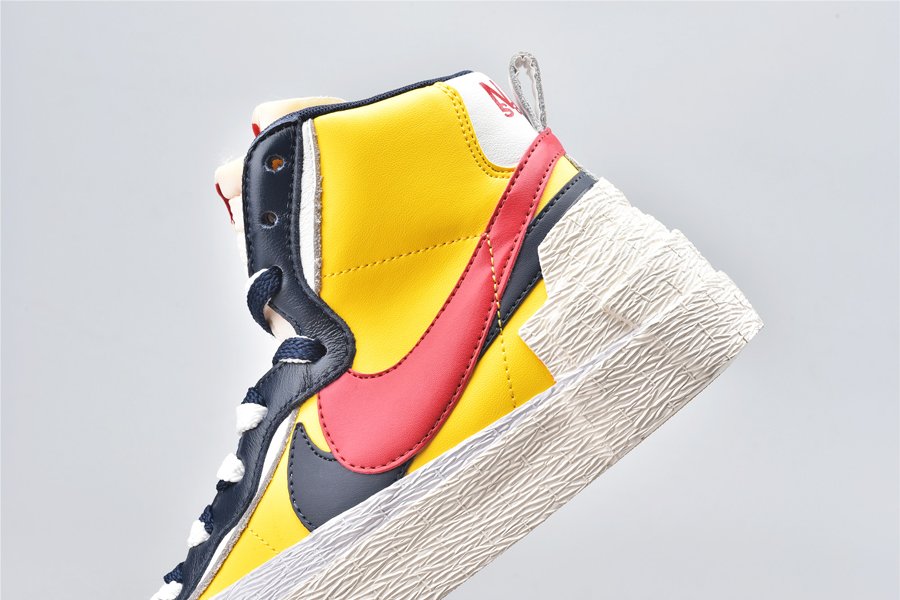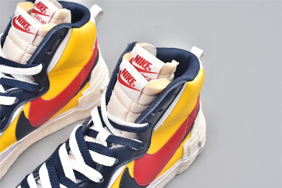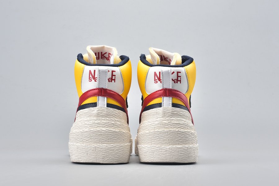 The premium leather construction features double Swooshes and double tongues, and layered eyestay panels. The midsole also has multiple layers of foxing that extend up the ankle area. This colorway features a Varsity Maize base with navy and red accents. Two sets of shoelaces are included to amplify the doubled-up effect.