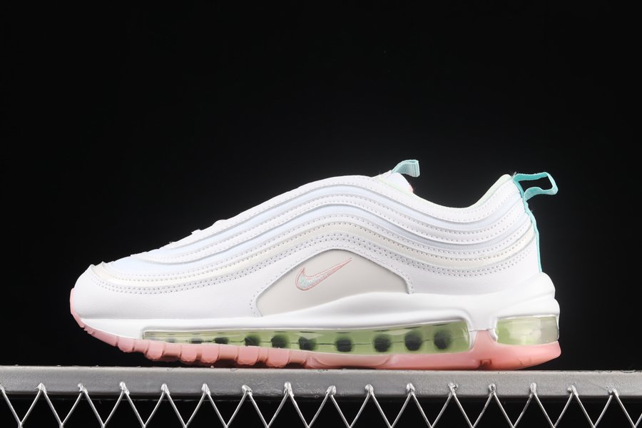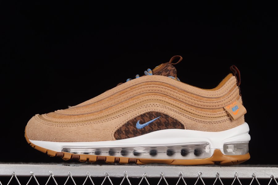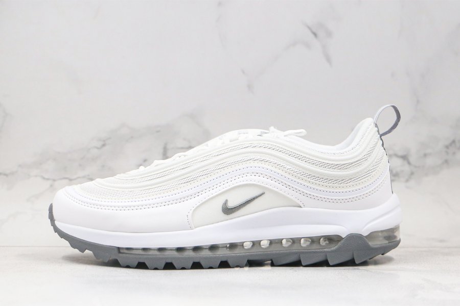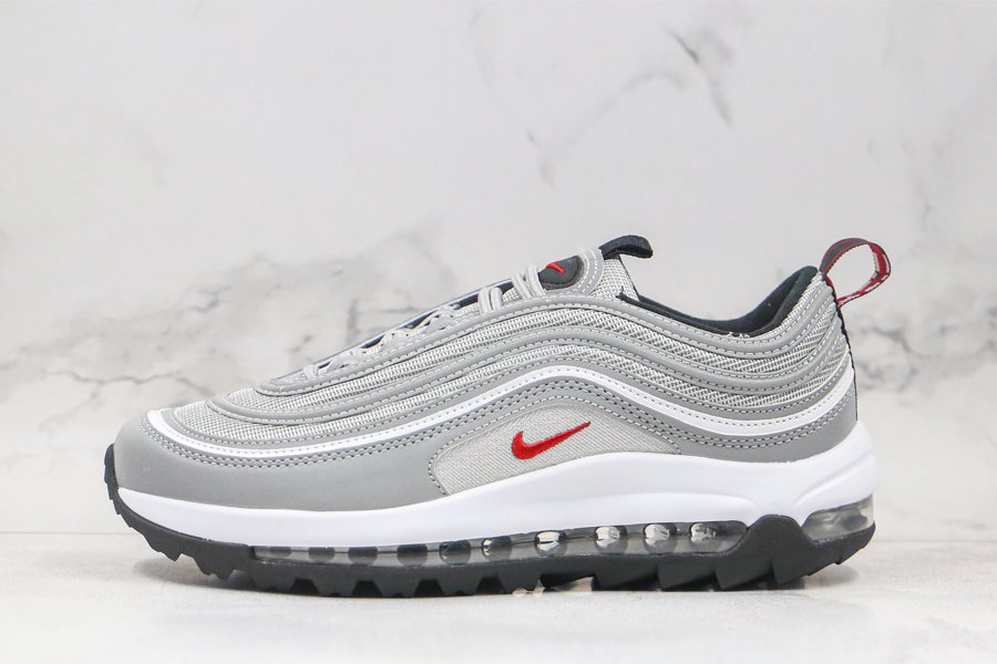 Premium leather features on this Air Max 97. That’s complimented by a soft nylon tongue along with a snug mesh inner lining. The wavy construct instantly brings that old school appeal along with the chunky Air Unit underfoot.