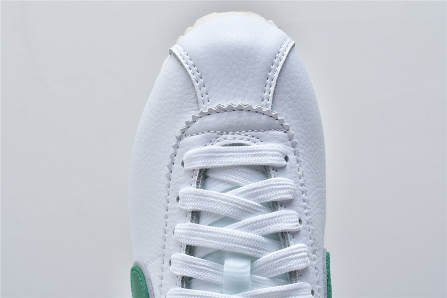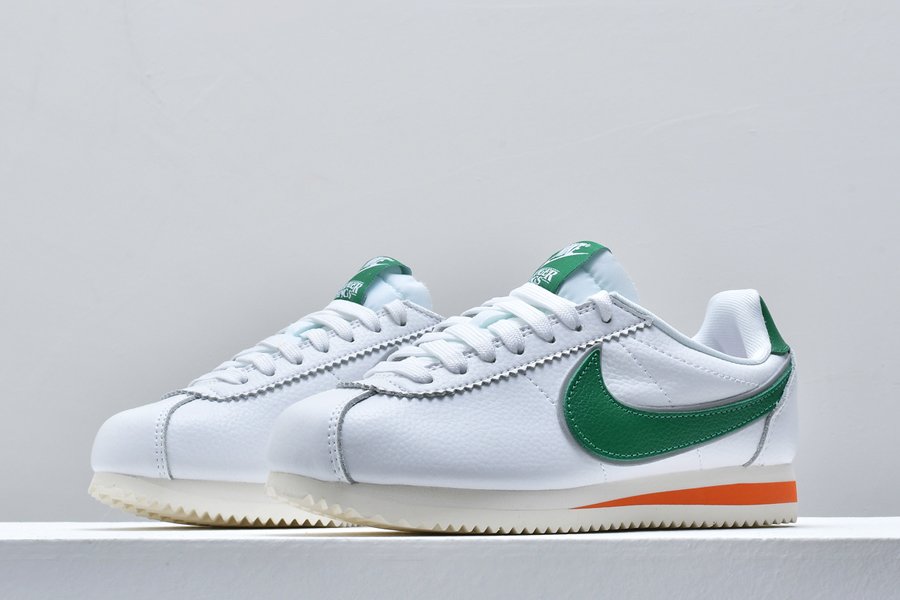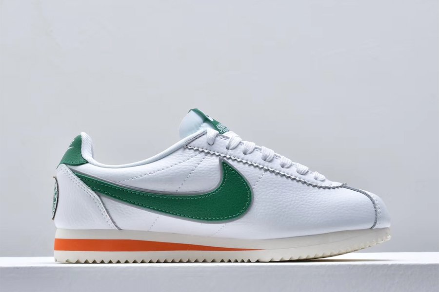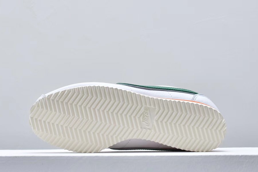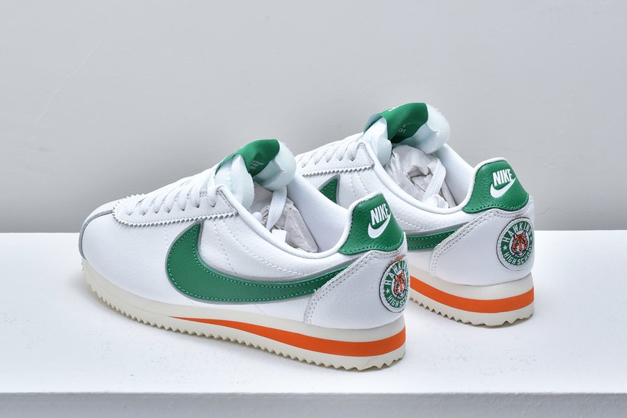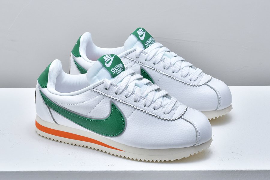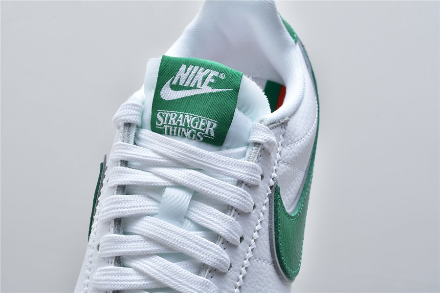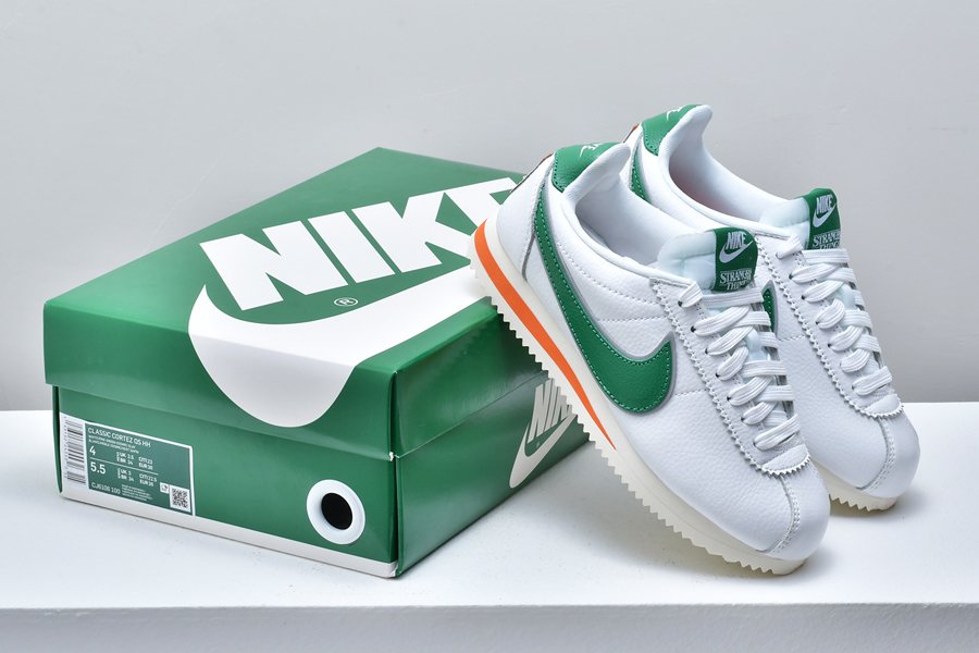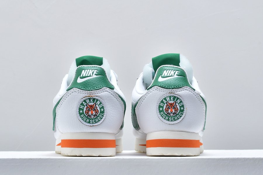 The Stranger Things x Nike Cortez ‘Hawkins High’ sneaker remixes the classic Nike Cortez with elements honoring the heroes’ transition into high school. The shoe features a leather upper with Hawkins High colors, green and orange, layered onto a white base. Details include ‘Stranger Things’ branding at the tongue and an embroidered patch at the heel to show off the school’s mascot.