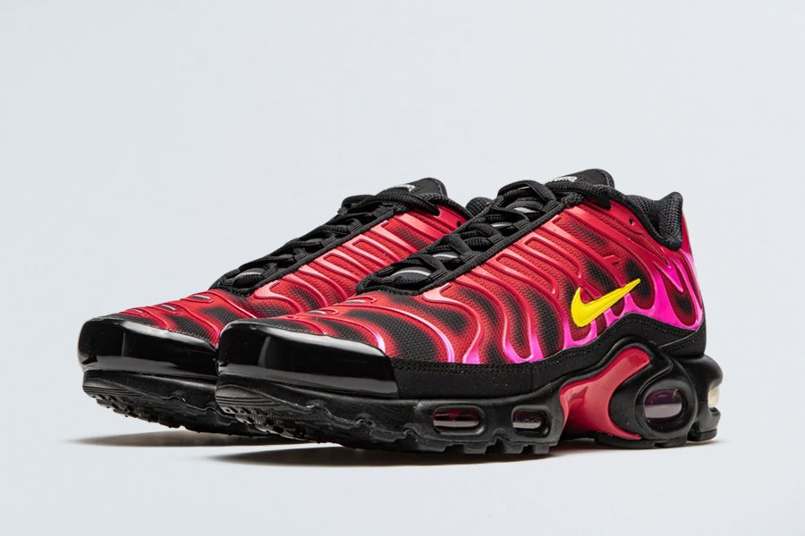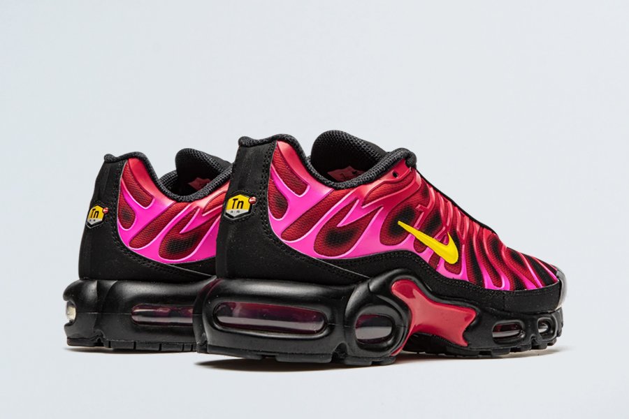 The Supreme x Nike Air Max Plus TN “Fire Pink” dons black for its overall base, the highlight consists of its signature wavy overlays which are coated in a gradient finish of Varsity Red and Fire Pink accents for a truly eye-catching finish. Finally, black midsoles with more hits of Fire Pink round out the design.