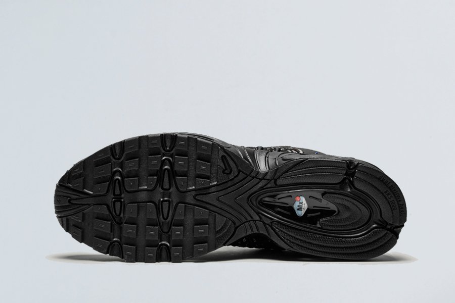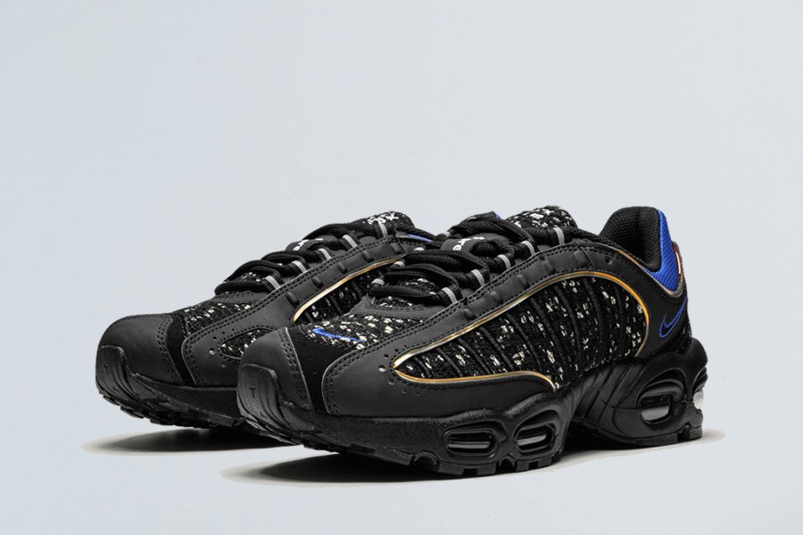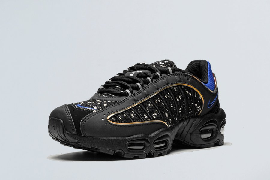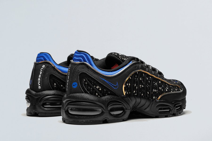 The Supreme x Nike Air Max Tailwind 4 “Black” is one of two colorways of the premium collaboration on the classic Nike running shoe. In March of 2019 Supreme debuted the first-ever retro of the Tailwind 4, a late-90s Air Max running shoe. The streetwear giant presented the model in a premium construction built with a boucle textile base with leather overlays. This colorway features a black and white bouclé base with embroidered striping and black nubuck overlays. Hyper Cobalt accents are found on the Swoosh branding and mesh heel panel. Iridescent gold piping and reflective hits add the final detailing. Supreme branding is added to the tongue tab, heel, and insole.