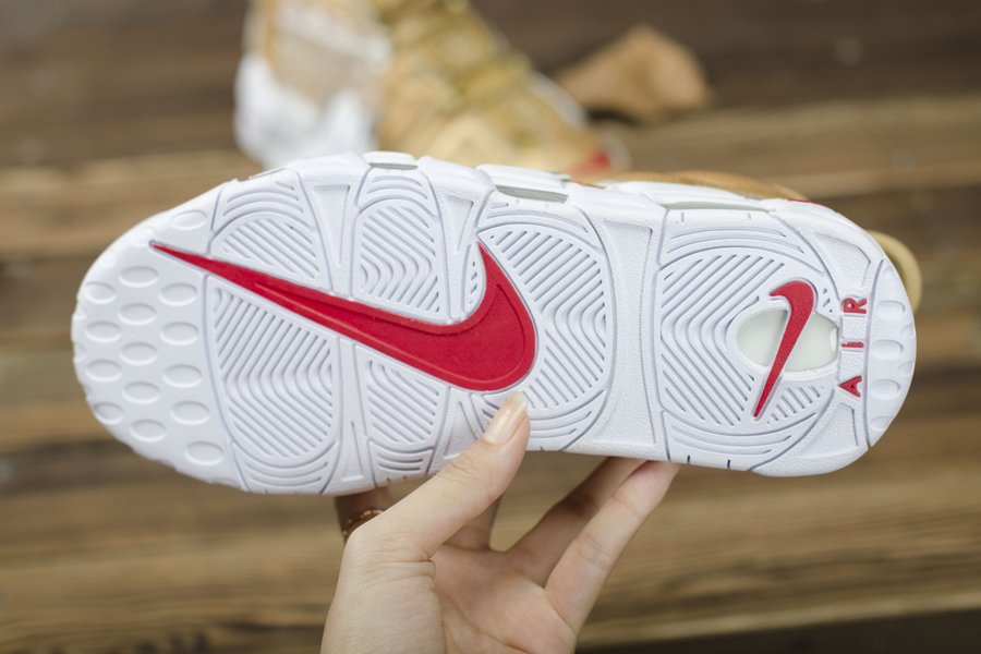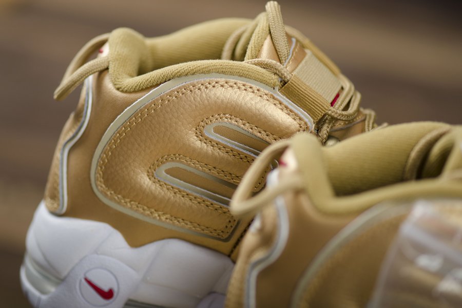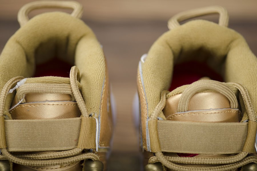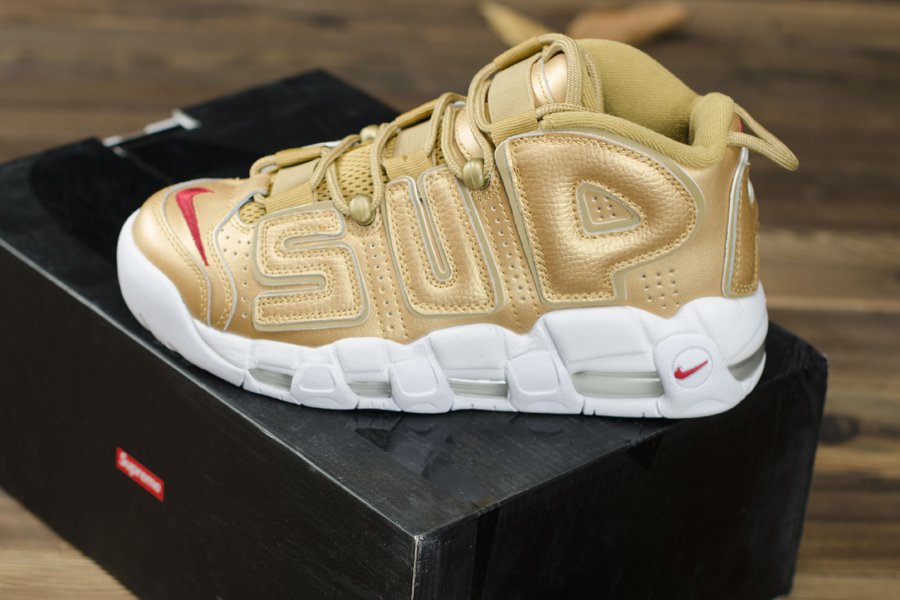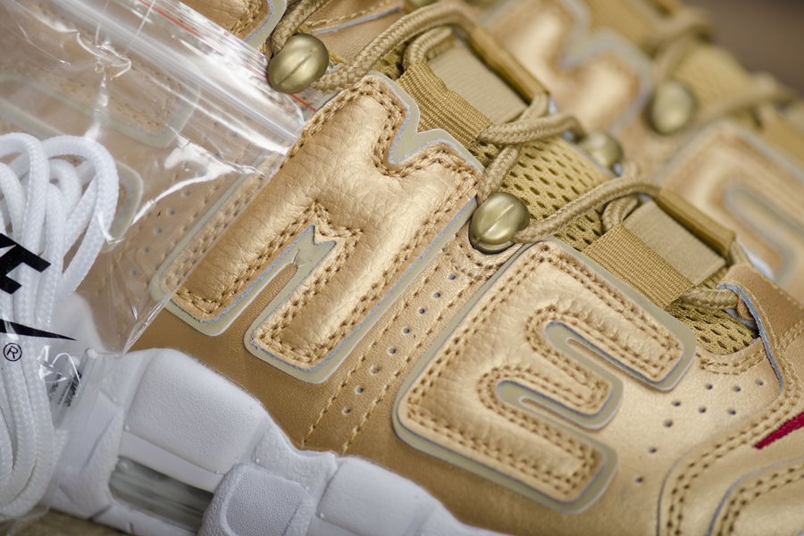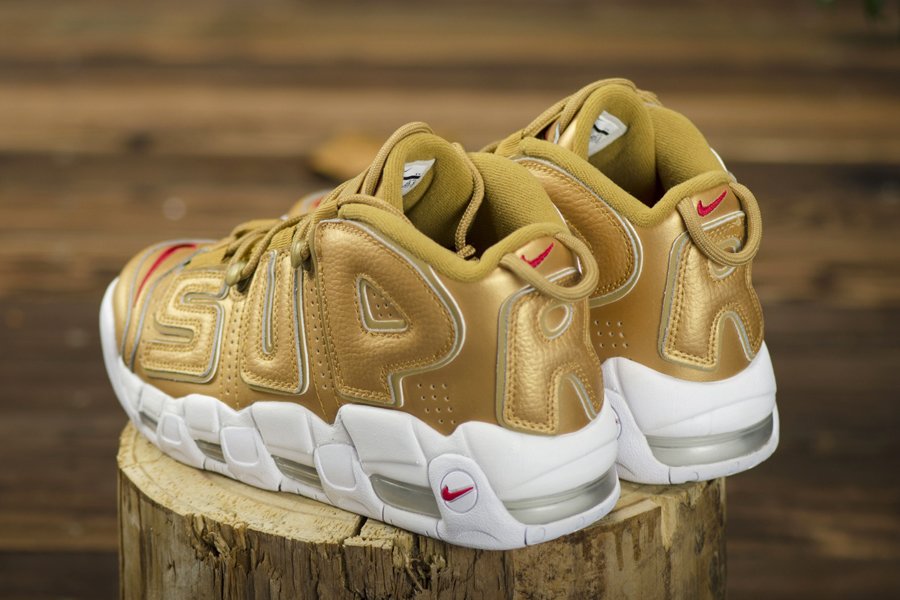 This Nike Air More Uptempo by Supreme is highlighted with Gold across the uppers. In addition it reads Supreme along the sides instead of AIR. Following we have Red on the Nike Swoosh while White covers the midsole and outsole. Currently it isn’t known if 3M reflective is added to the pipping.