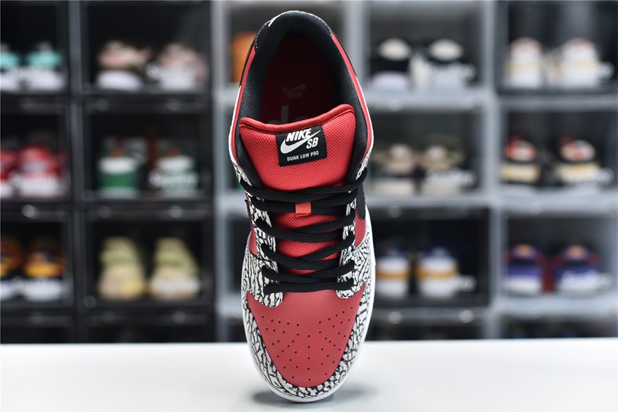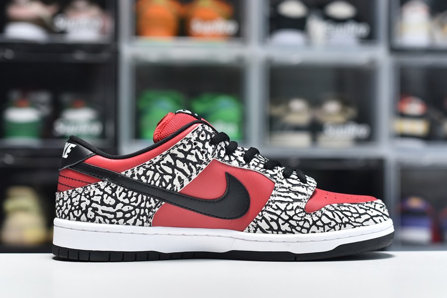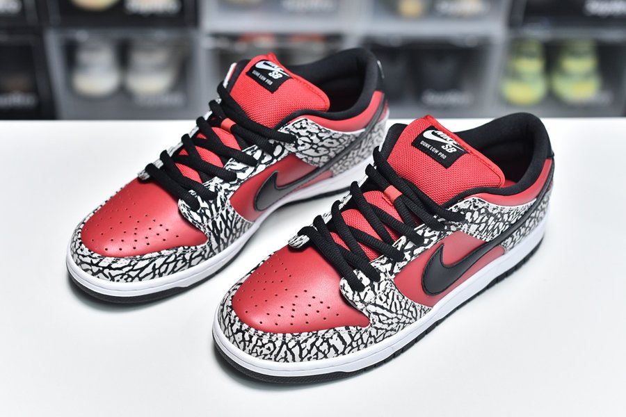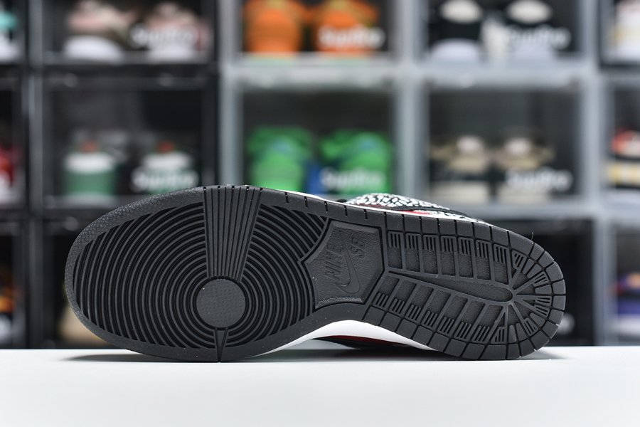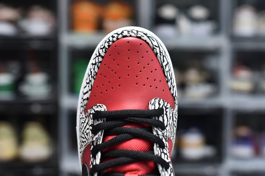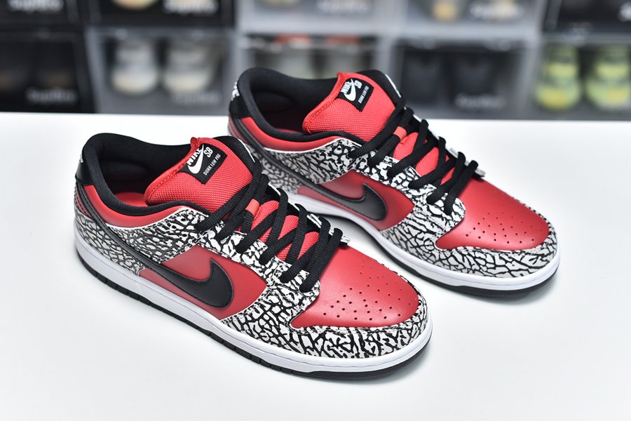 The Supreme x Nike SB Dunk Low features a grey cement print overlays, along with red leather underlays on the toe box, quarter panels, ankle, and tongue. Finishing off the look is a white midsole and black outsole.