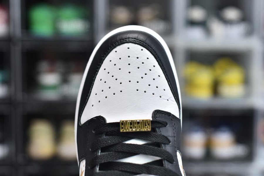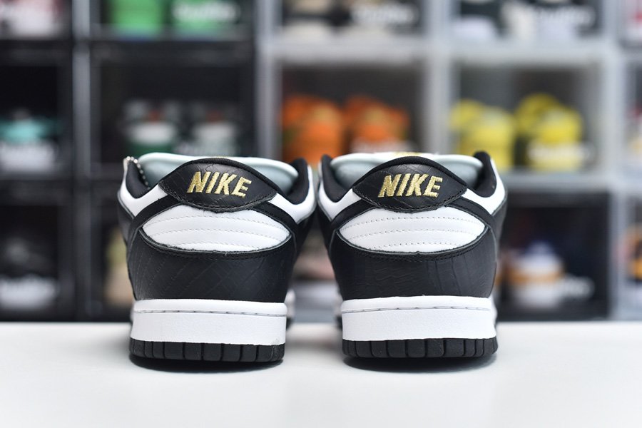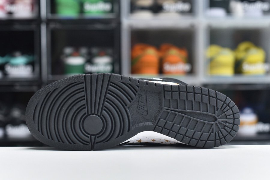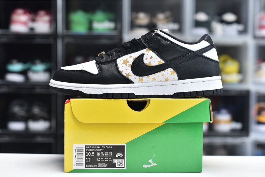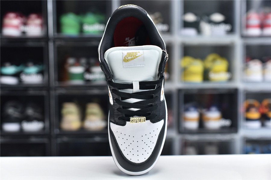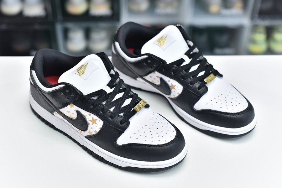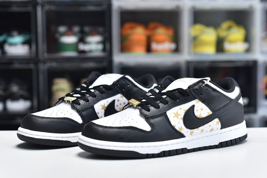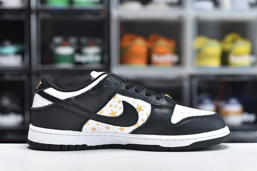 The Supreme x Nike SB Dunk Low “Black Stars” flaunts the distinct gold stars print pattern on its side panels, while croc skin overlays further elevate the style. Finally, more gold accents throughout and Supreme lace dubraes, followed by Supreme-branded insoles top off the style.