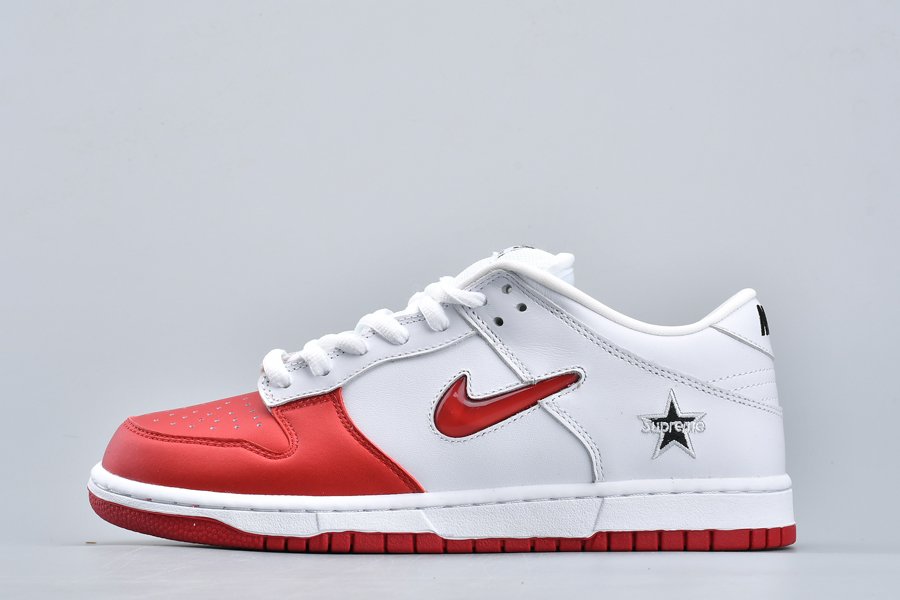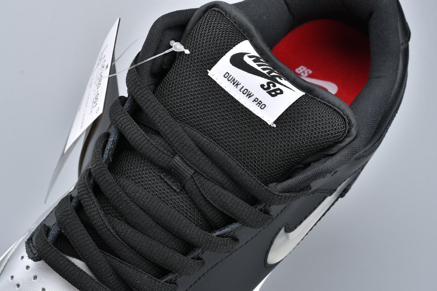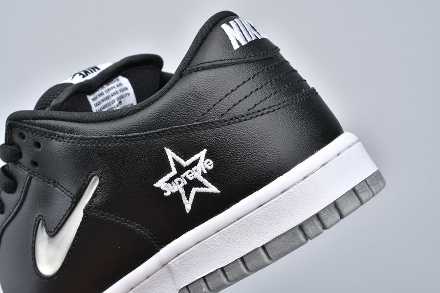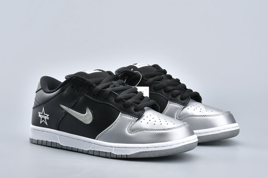 The Supreme x Nike SB Dunk Low “Metallic Silver” dons the hue across its shiny leather toe box and mini jewel Swooshes on the sides. Black covers the remainder of the upper, while finishing touches include a Supreme star logo on the lateral heel, followed by a white midsole, grey outsole and custom Supreme-branded insoles.