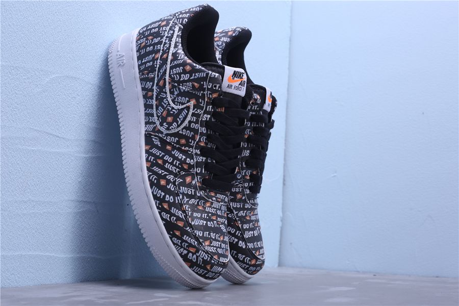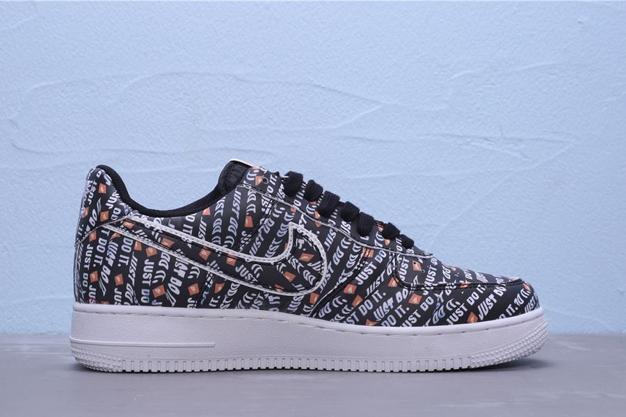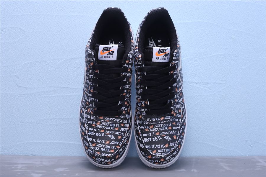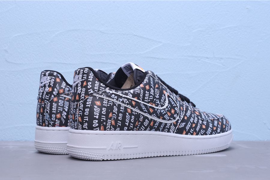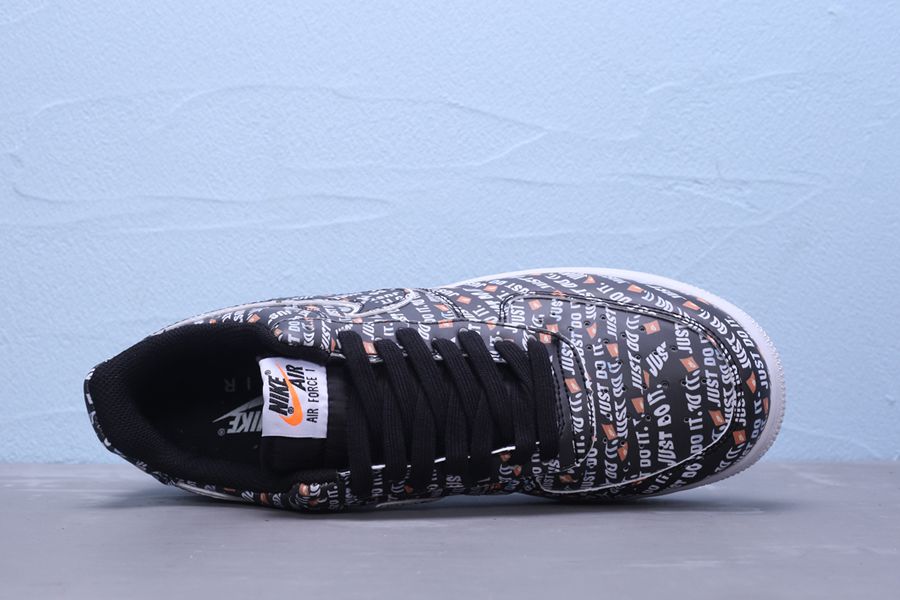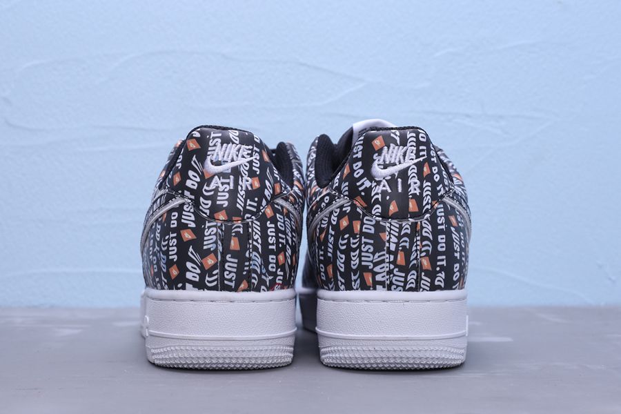 The most noticable feature of this pair is the transluscent Nike Swoosh which features “Just Do It” text covering its entirety. In addition, various Nike logos can be found on both the lateral and medial sides of the otherwise all-black Air Force 1 Lows.